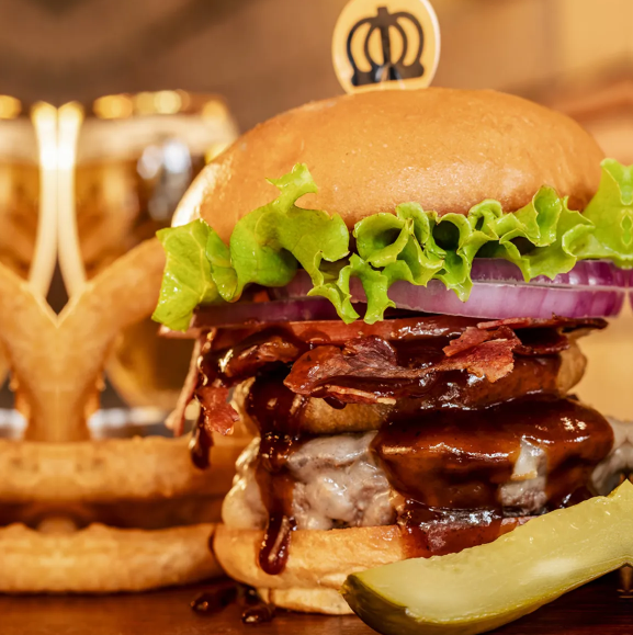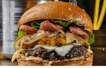 Carne 100% angus, filete de pollo, pan brioche, tocineta ahumada, tomate, lechuga, cebolla grillé, queso, salsa de la casa.