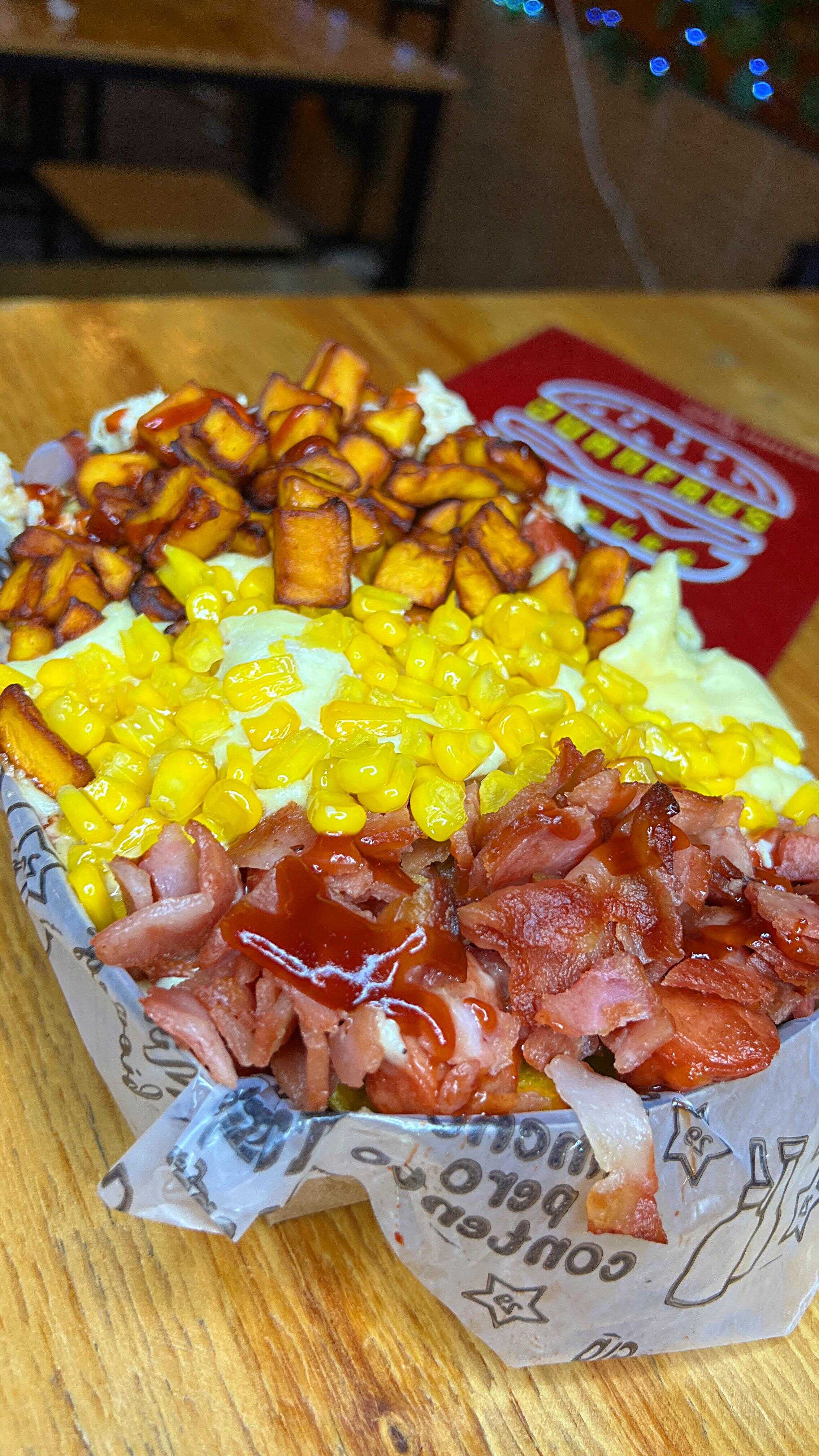 Papita Criolla, salchicha, maíz, tocineta, madurito y queso.