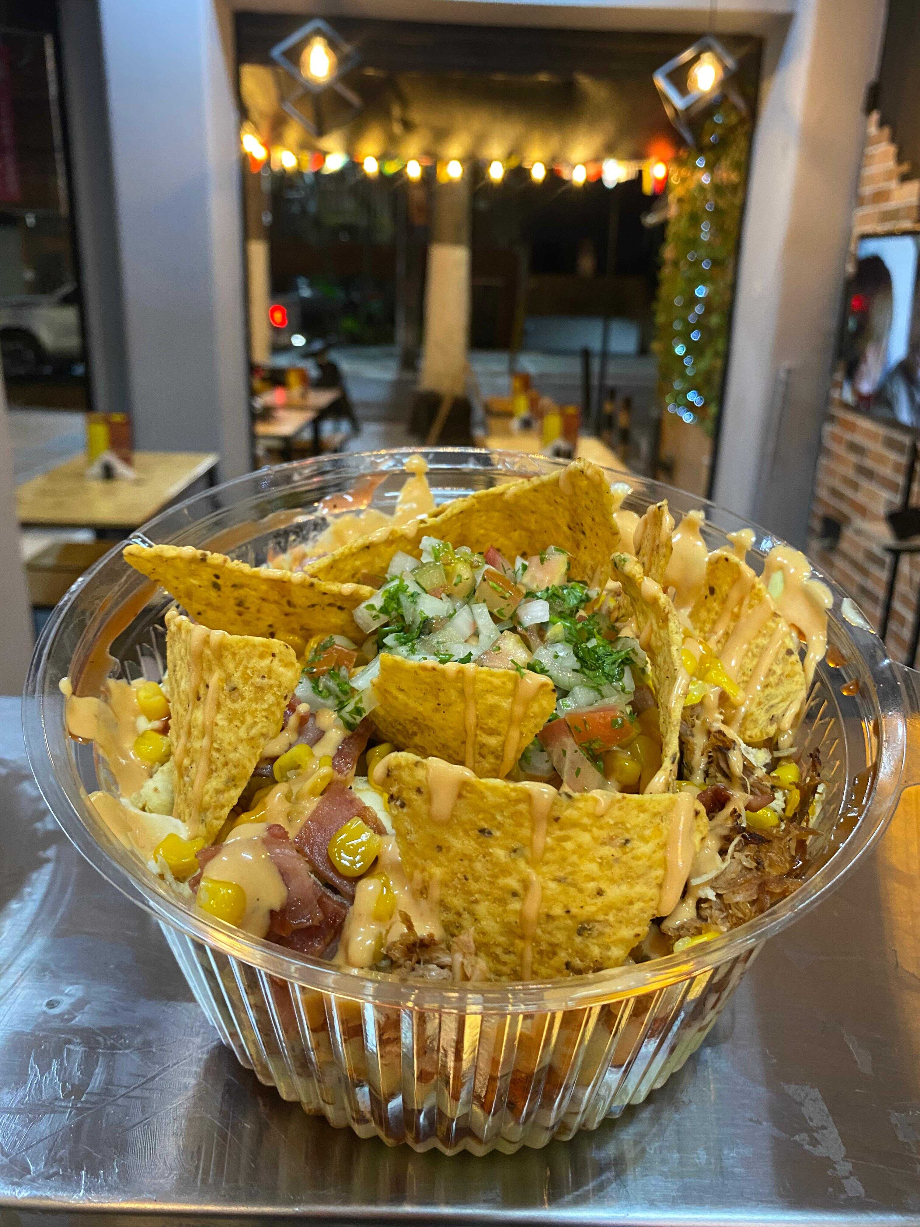 Papa criolla, pollo desmechado, maduro, salsas de la casa, pico de gallo, queso y nachos.