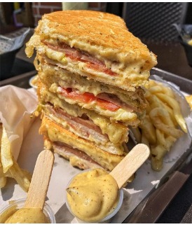 Dos Sándwich cubanos (Jamón, lechuga, tomate, queso, pan orégano, salsa de ajo) acompañado de nuestras Papas con Tocineta Salsa Cheddar