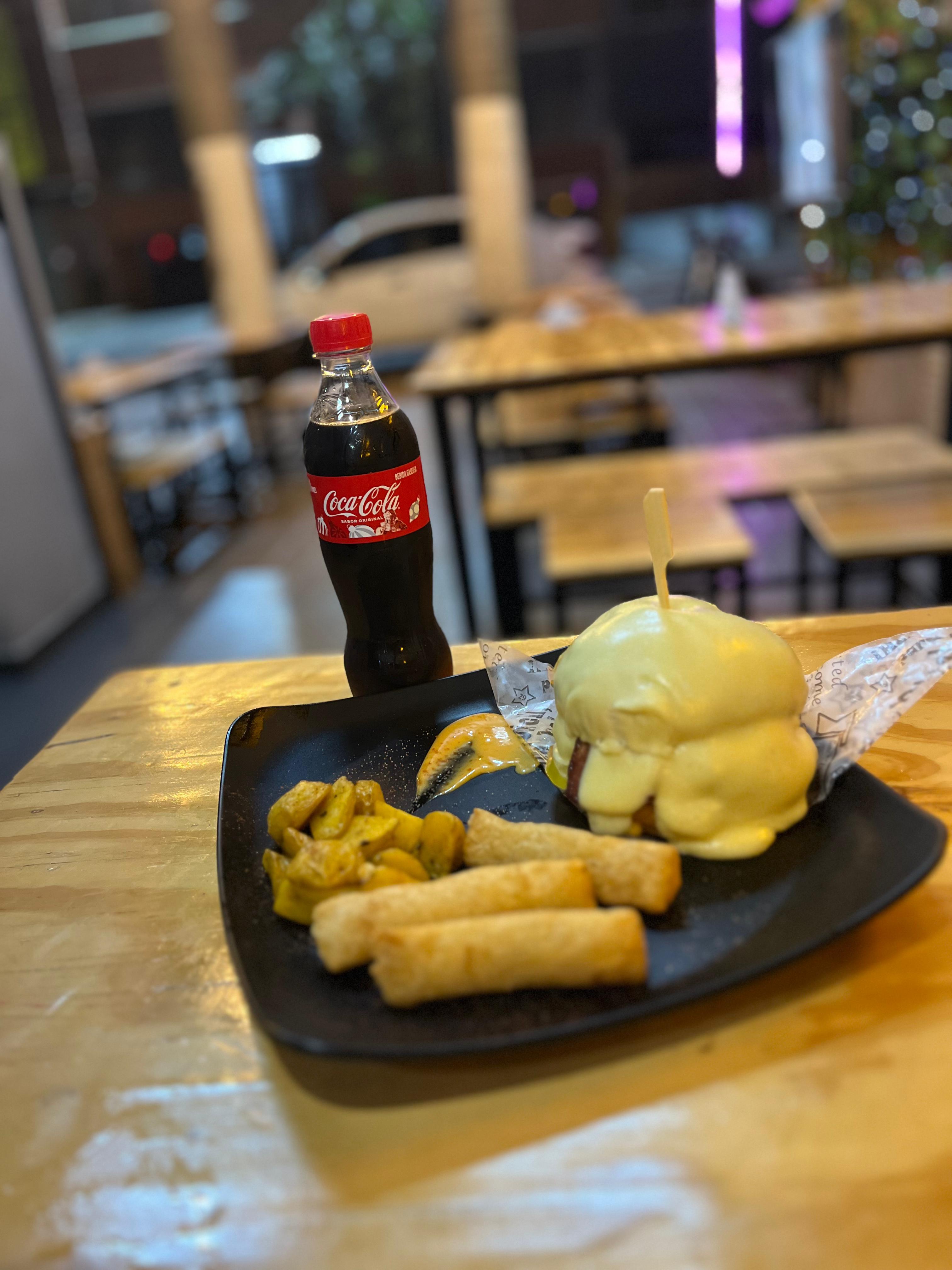 hamburguesa de res bañada en queso + 3 croquetas de yuca + 75gr de papa amarilla