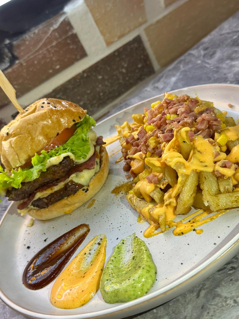Hamburguesa Doble (Carne artesanal 100% angus, tocineta ahumada, cebolla grillé, queso, salsa de la casa, pan brioche) + Papas con Tocineta⚡⚡