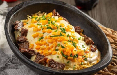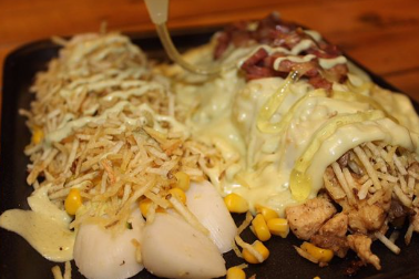 Pollo, carne en salsa BBQ, tocineta, maíz, pico de gallo, maduro, queso, nachos, acompañado de papa criolla.