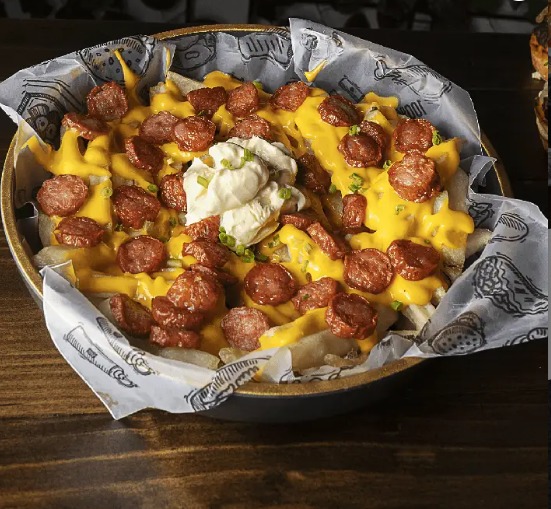 Salchicha americana, pulled pork, tocineta, queso cheddar, cebolla grillé, salsa de la casa, pan artesanal, nachos triturados, acompañado con papas criollas.