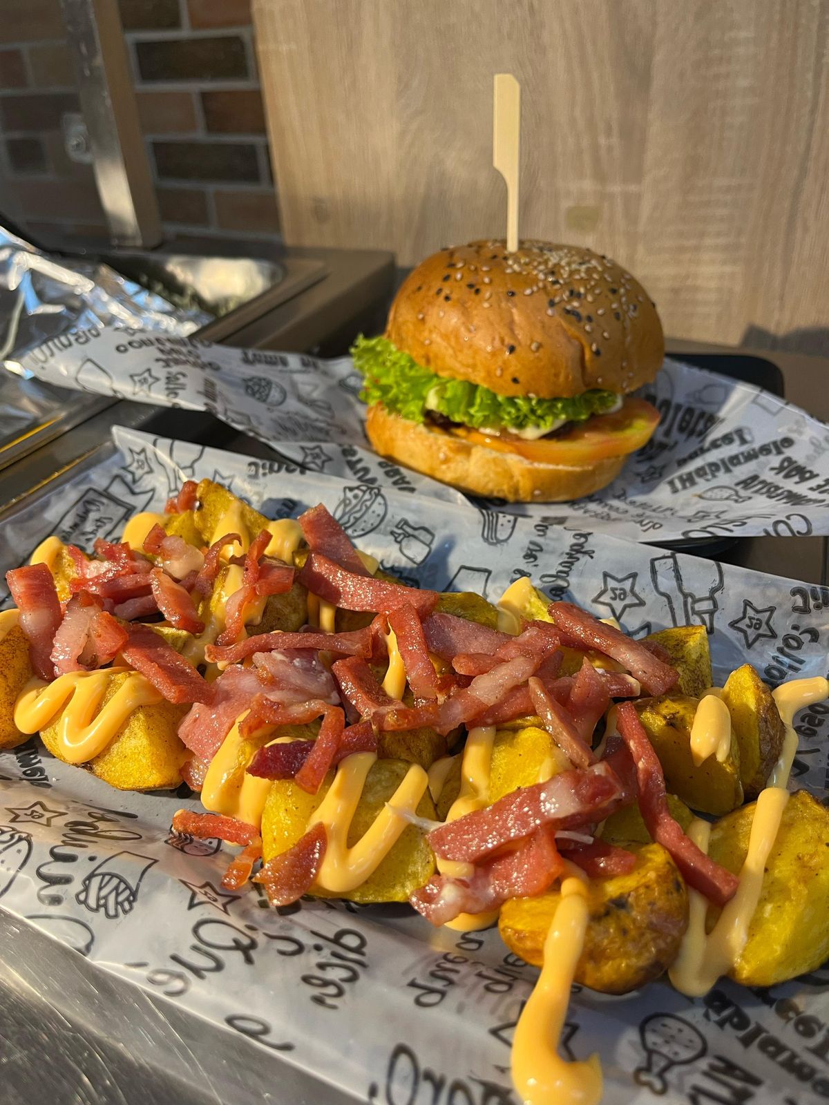 Papas con Tocineta y queso cheddar + Hamburguesa Clasica (Pan, carne, queso, lechuga, tomate, cebolla y salsas)