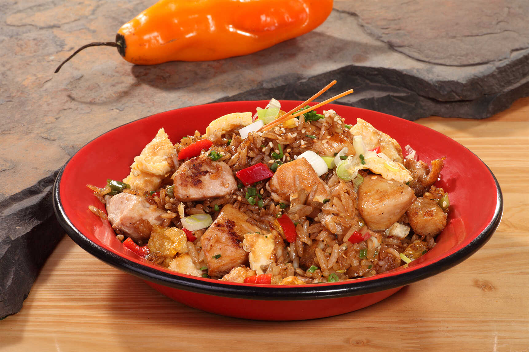 A nuestro chaufa clásico lo engallamos con un pollo bañado en salsa de ostión. Un clásico de la cocina chino peruana.