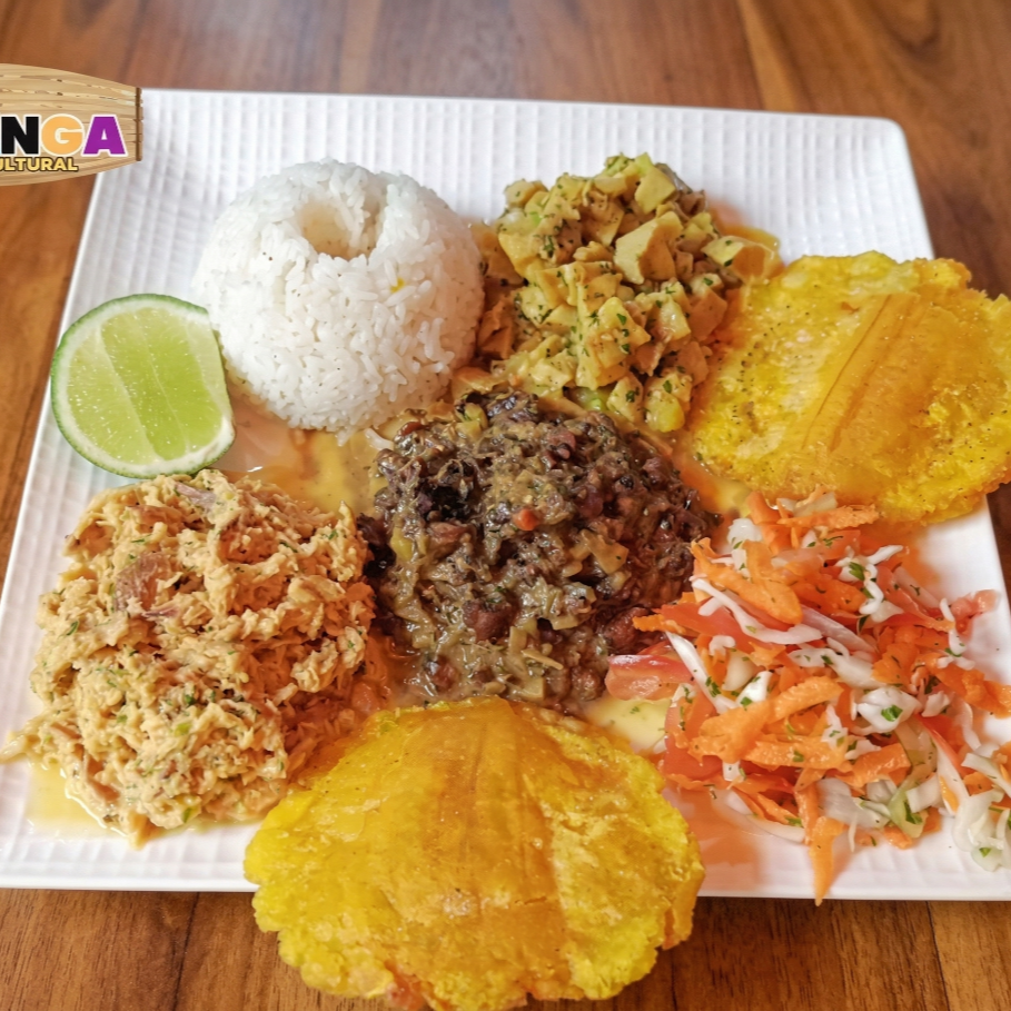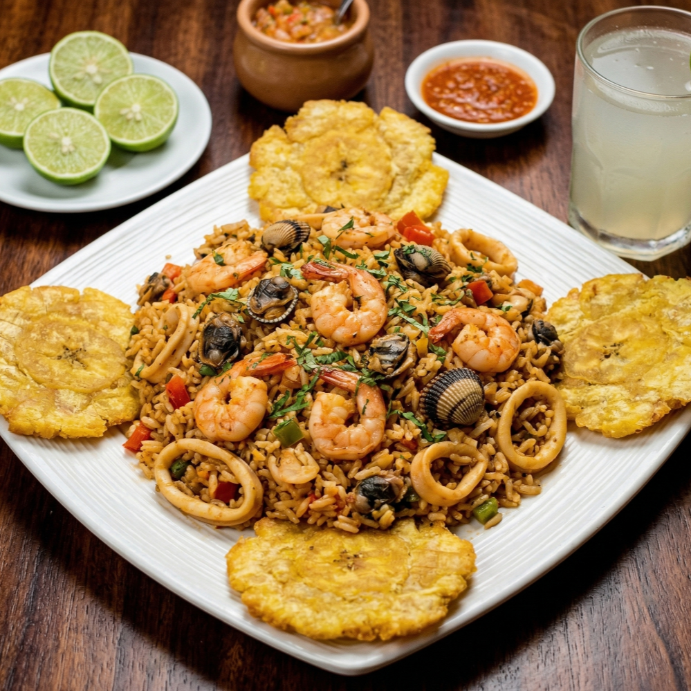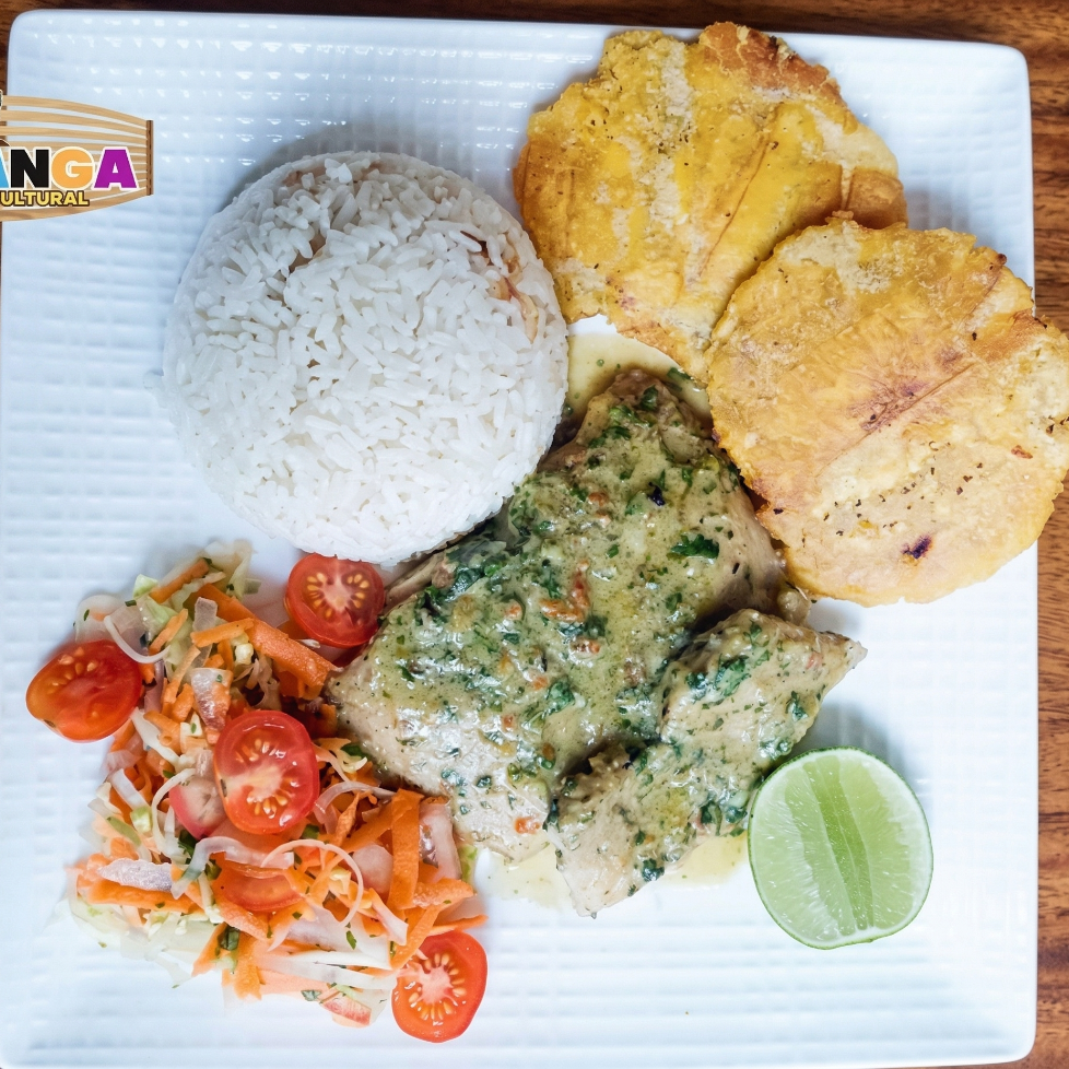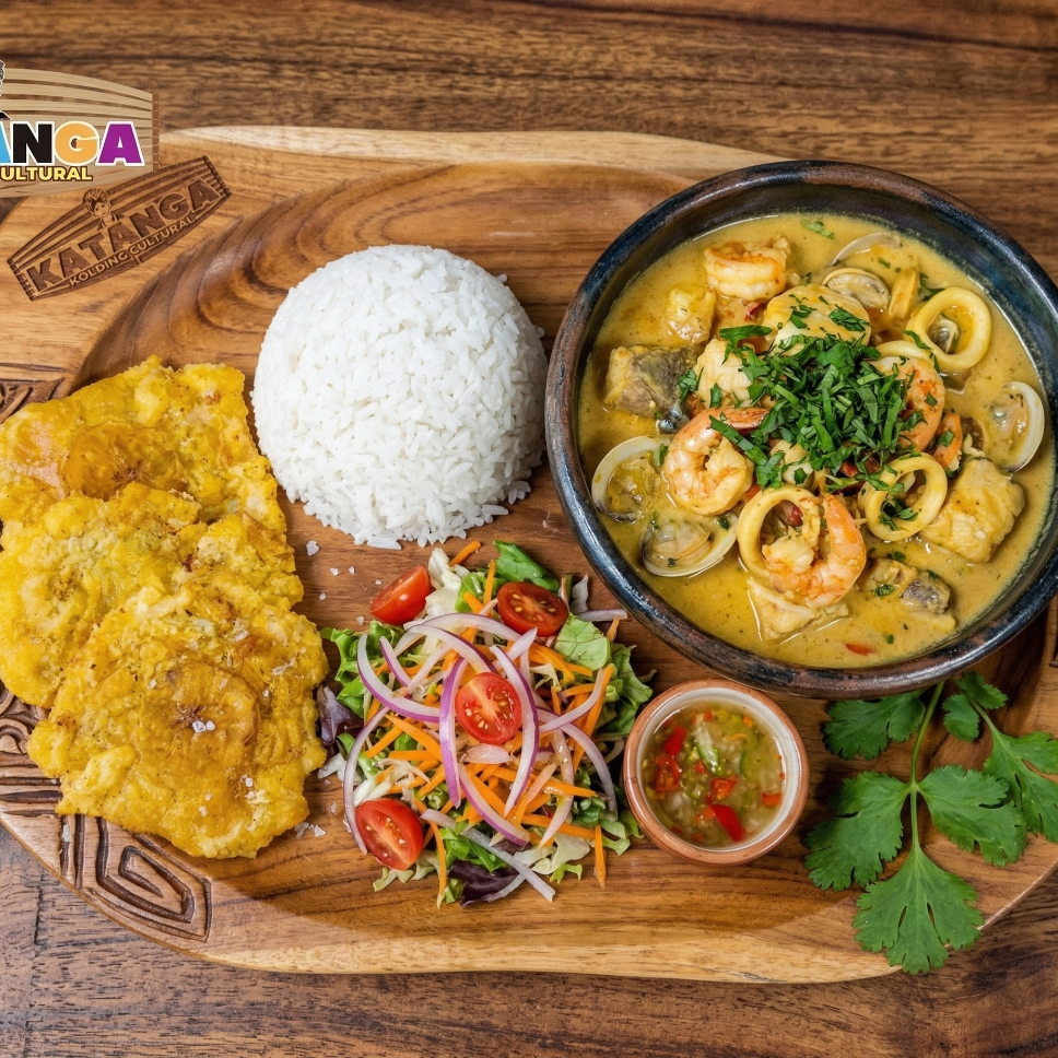 Corvina, camarón, piangua y calamar, mariscos guisados en sumo de coco, arroz, ensalada de la casa y patacones.