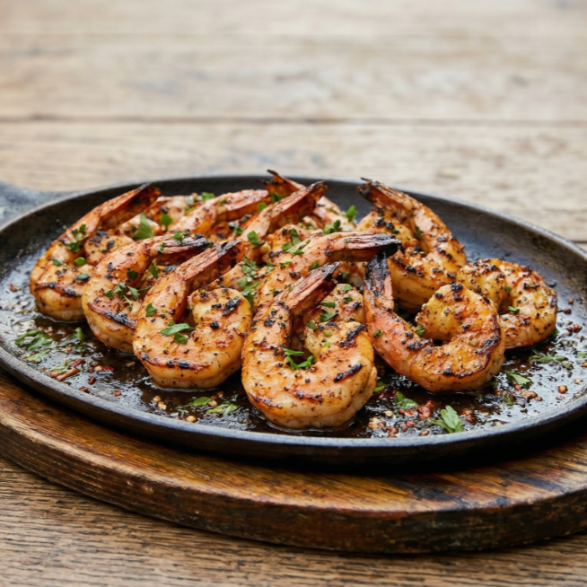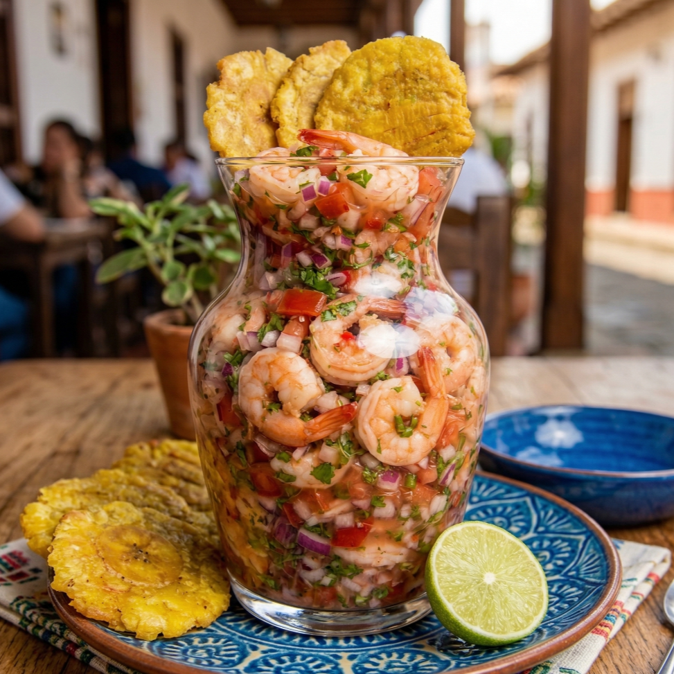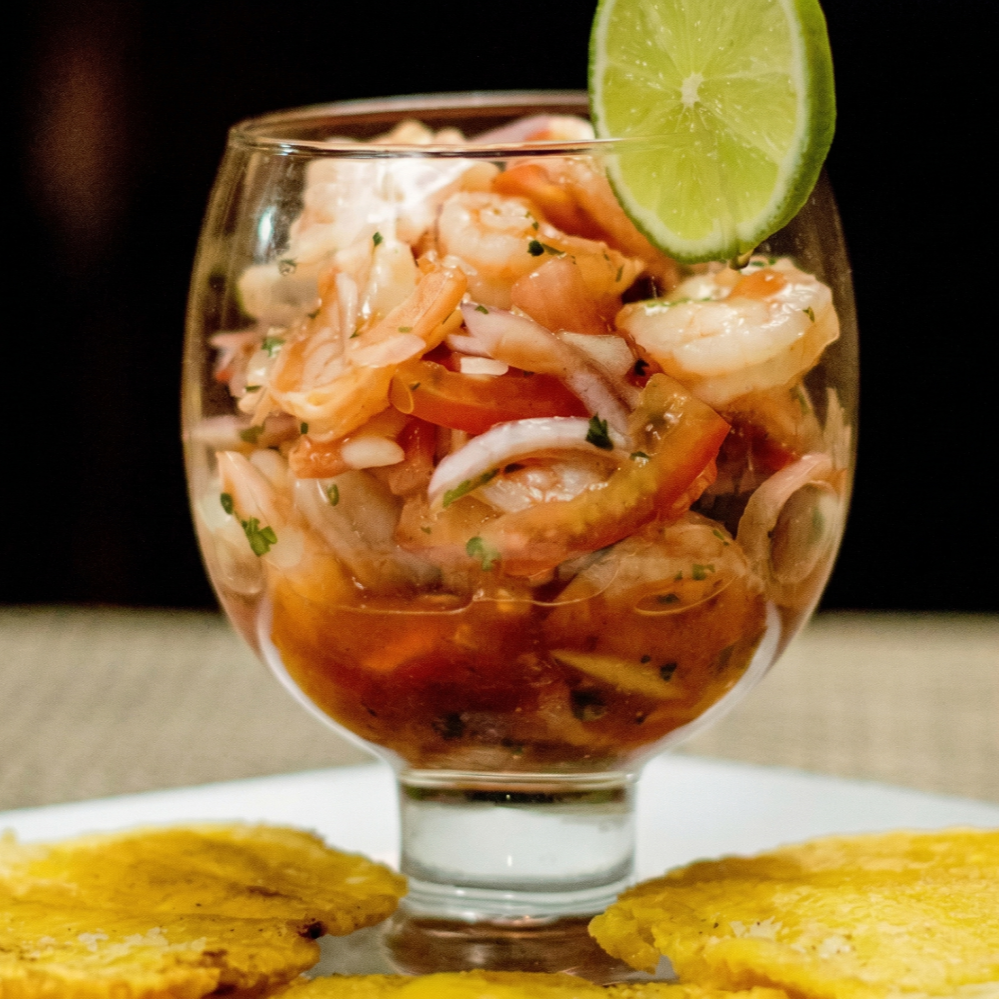 Langostinos, cebolla, tomate, cilantro, sumo de limón y salsa de tomate.