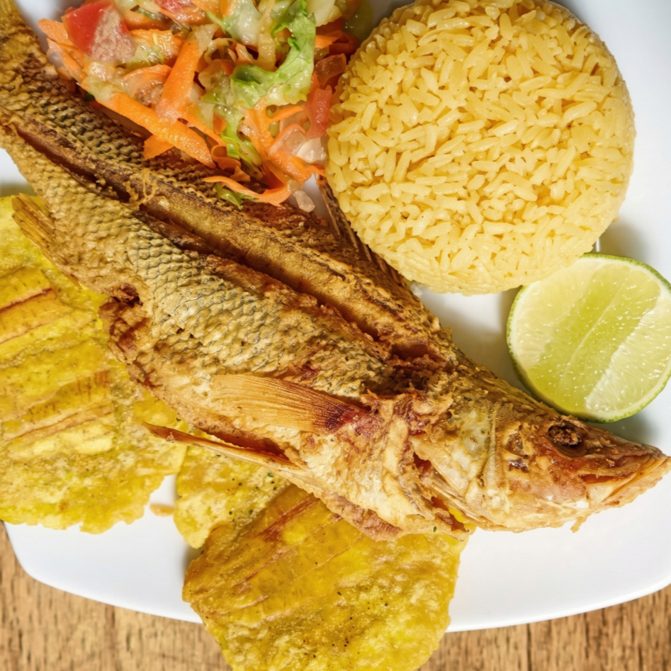 Filete de tilapia frito o encocado de camarón, sopa del día, limonada de la casa, arroz, ensalada de la casa y principio del día.