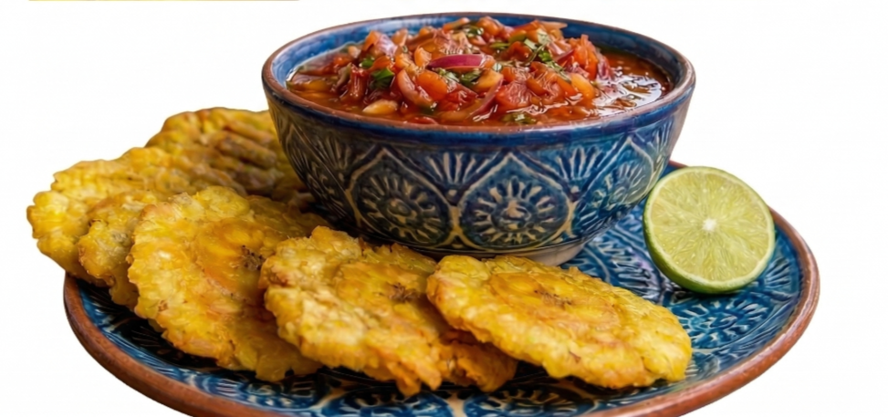 Pescado corvina mezclado con cebolla, tomate, cilantro, sumo de limón, salsa de tomate y patacones.