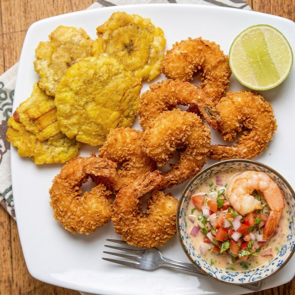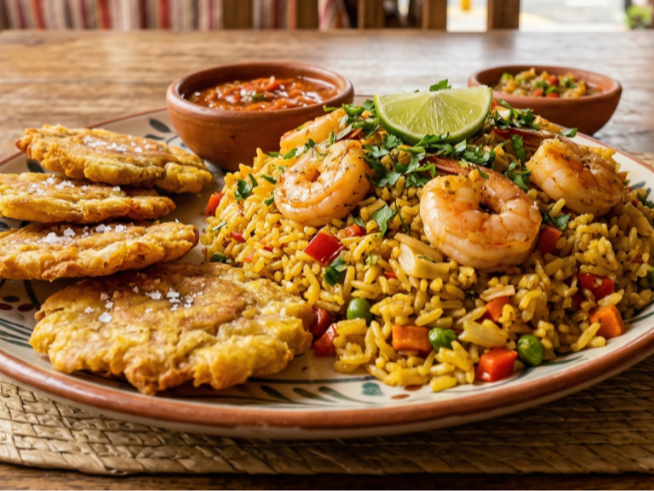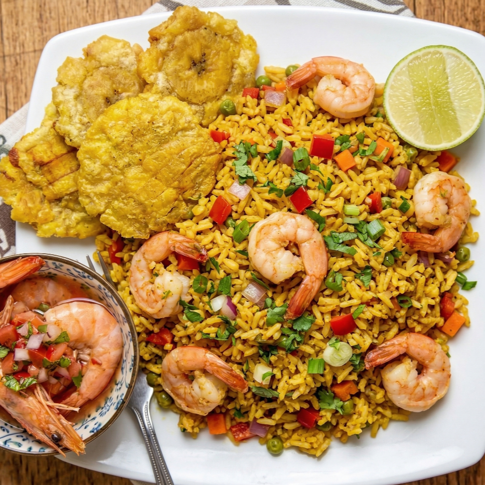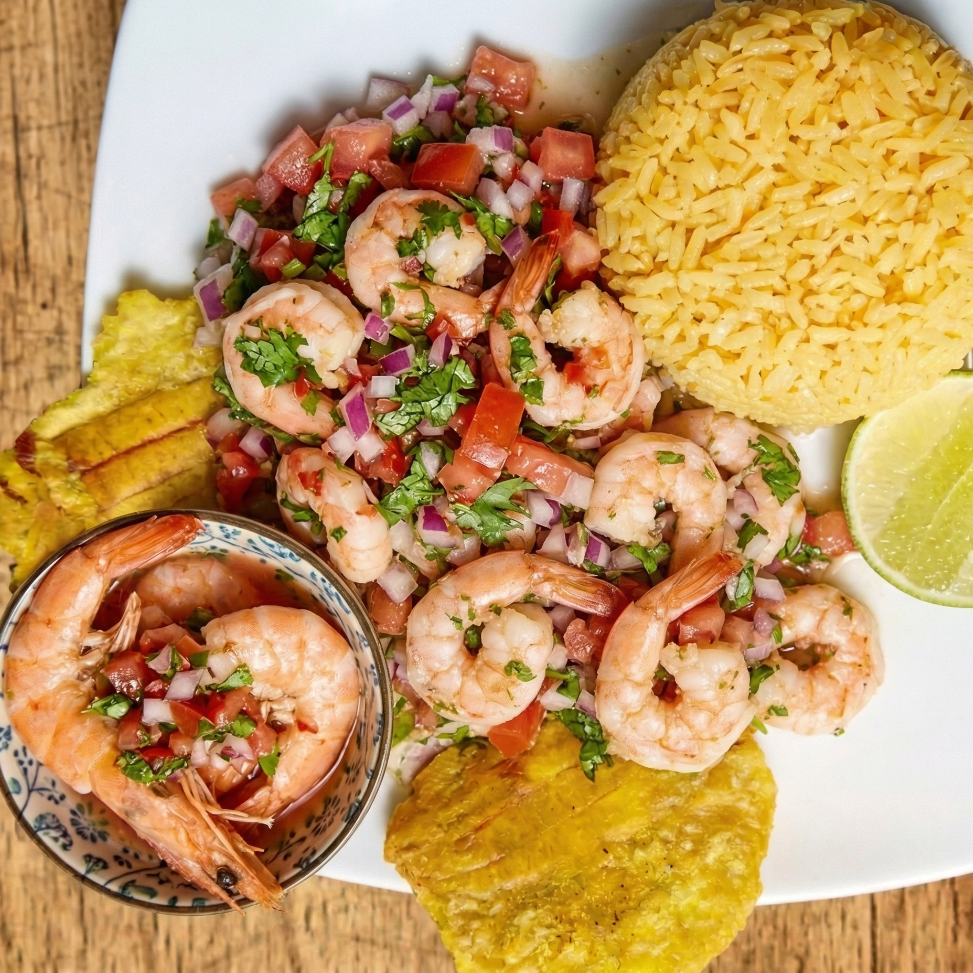 Camarones acompañados de arroz, ensalada de la casa, tajadas de plátano, limonada de la casa y sopa de mariscos.