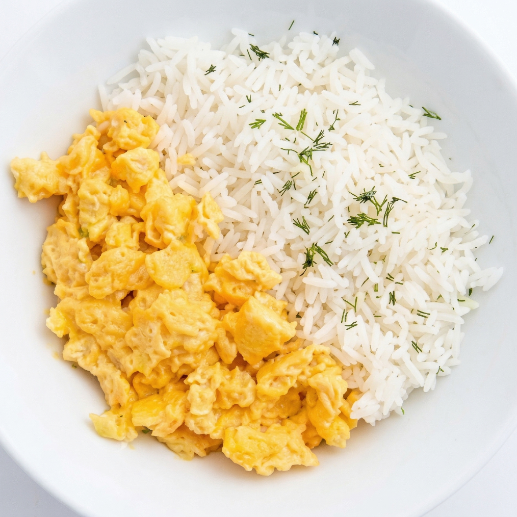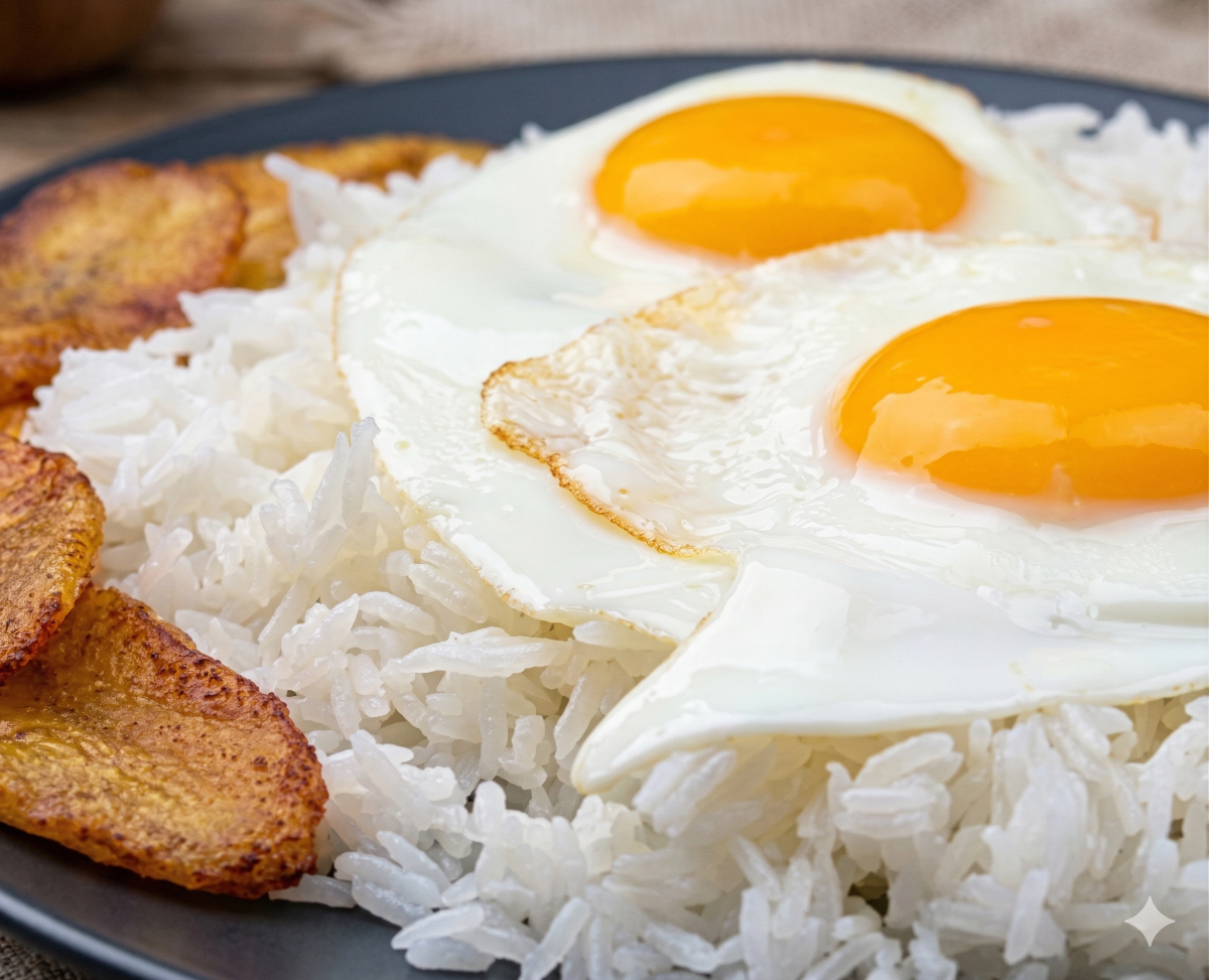 Huevos acompañados de arroz y patacones y bebida a elección.