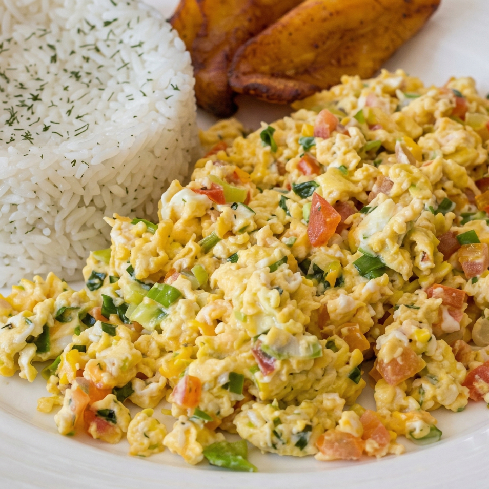 2 Huevos con tomate y cebolla, porción de arroz, patacones y bebida a elección café, chocolate o aromática.