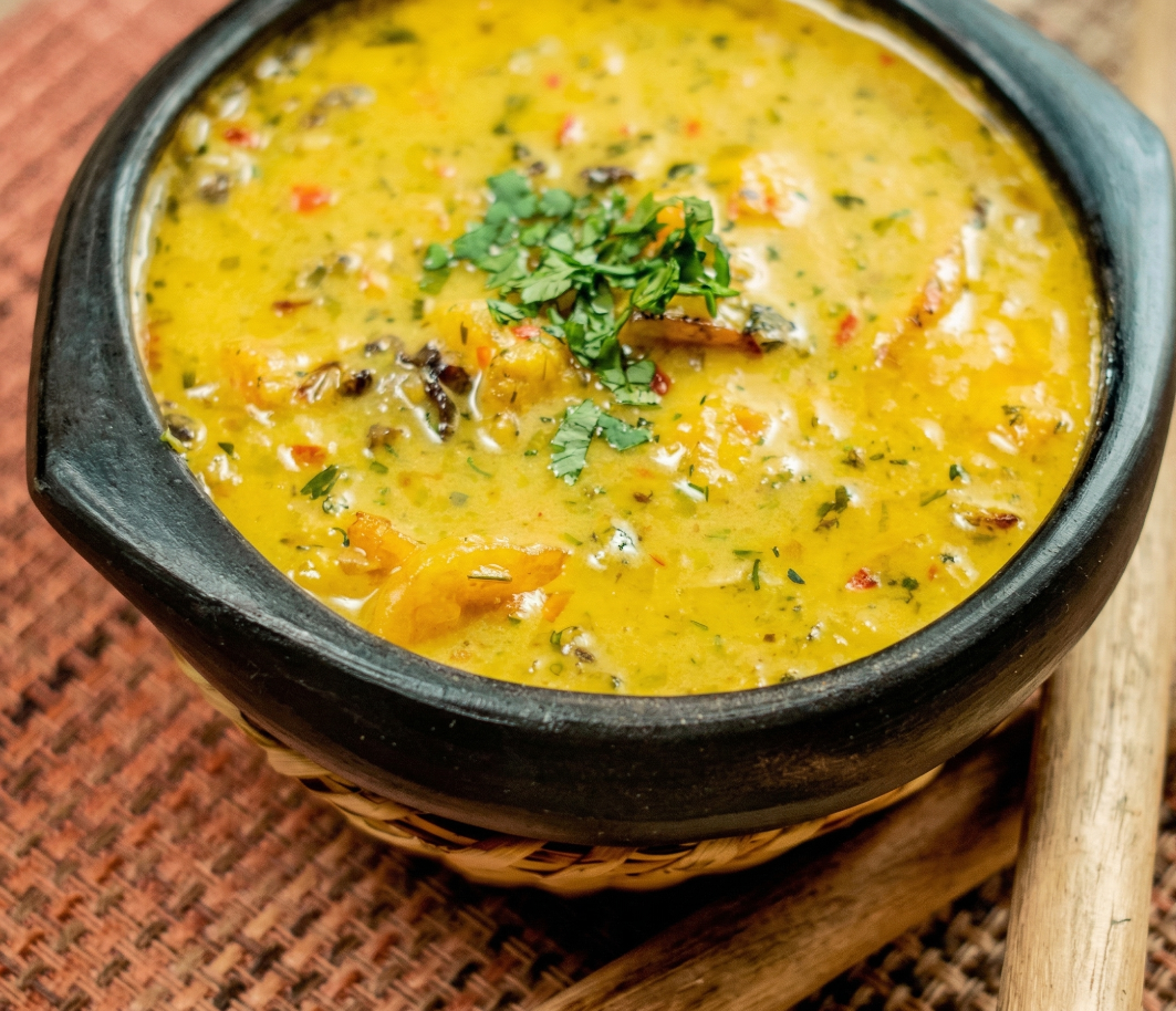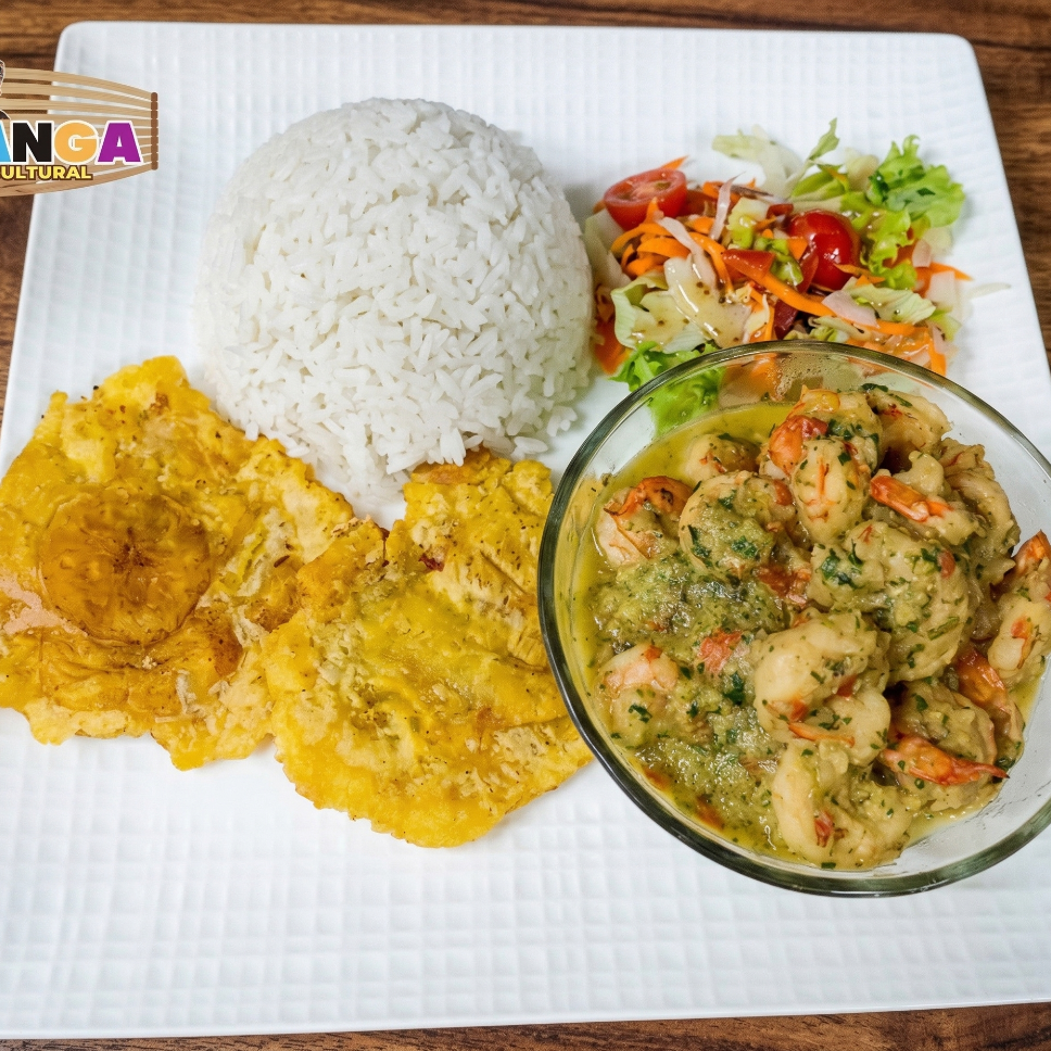Camarón, piangua y calamar guisados con sumo de coco 100% natural, arroz, ensalada de la casa, patacones y yerbas de azotea tradicionales del Pacífico.