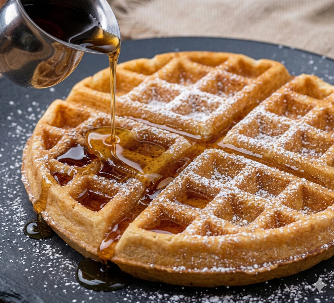 Deliciosos waffle tradicionales acompañados de bebida a elección.