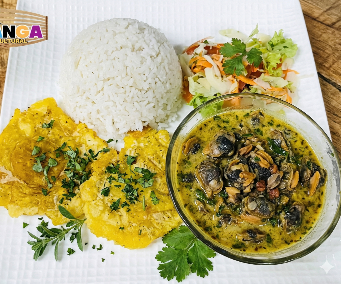 Mariscos, camarón, piangua y calamar guisados en sumo de coco, arroz, ensalada de la casa, patacones y yerbas del Pacífico.
