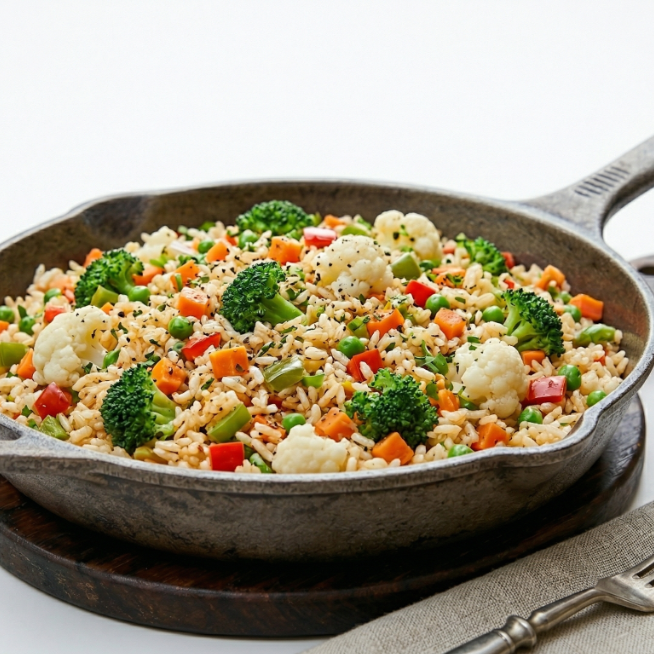 Delicioso arroz con verduras, zanahoria, arvejas, pimentón, brócoli y coliflor.