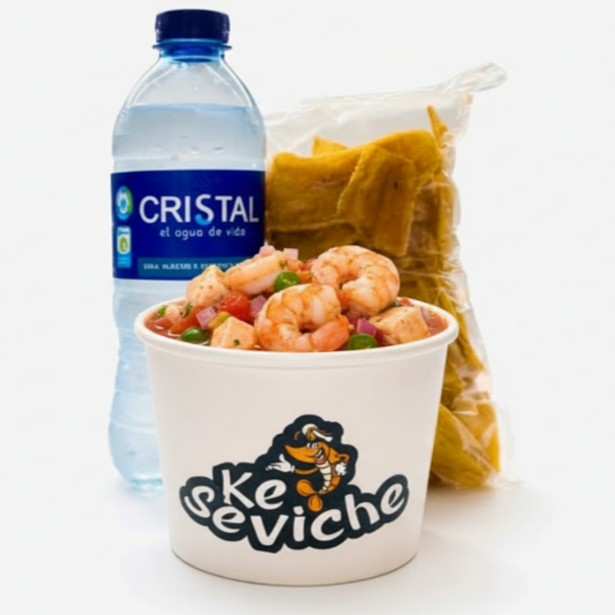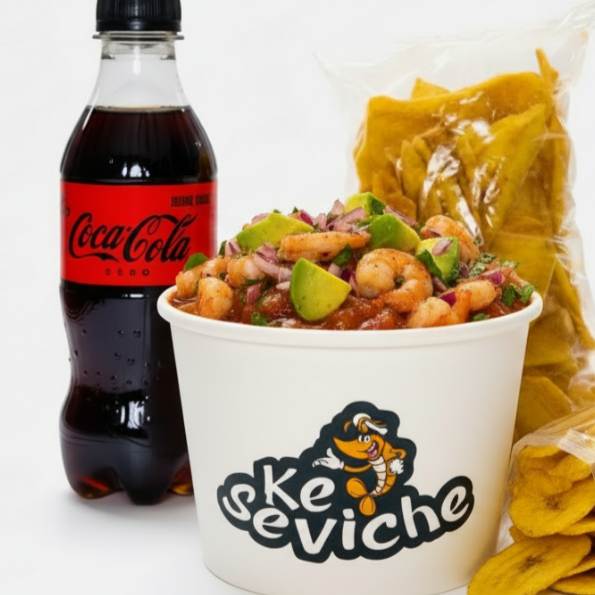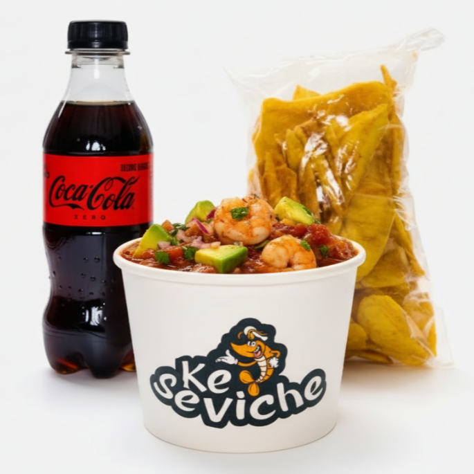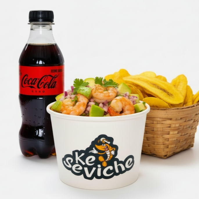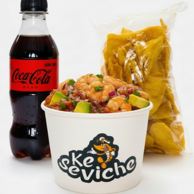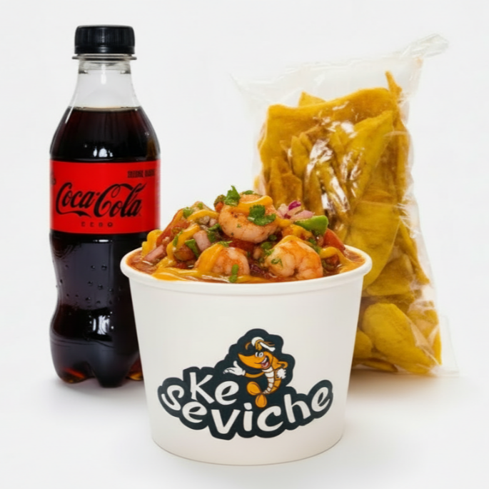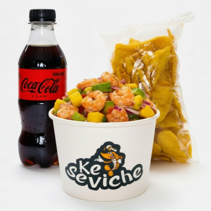 Estilo pacífico colombiano, a base de salsa de tomate, cilantro, cebolla, camarones cocidos, salsa de mango dulce y nuestro ingrediente secreto acompañado de galletas o platanitos a elección y gaseosa o agua a elección
