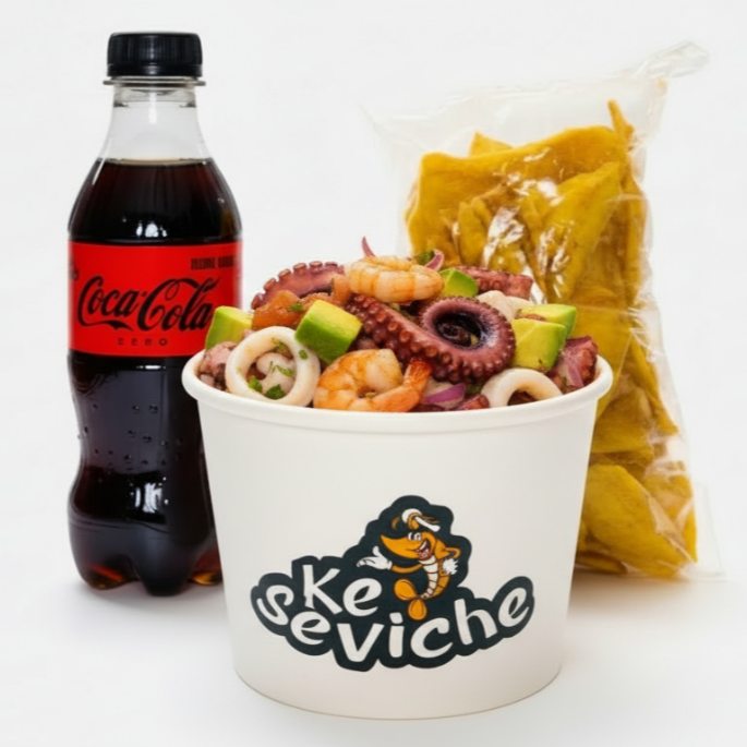Mezcla tradicional con trozos de calamar, pulpo y camarones cocidos con aguacate fresco, cilantro y nuestro toque secreto (referenciado como "mix tentacles") acompañado de galletas o platanitos a elección y gaseosa o agua a elección