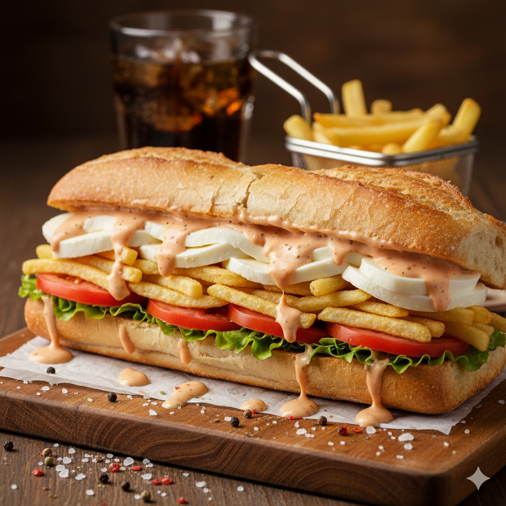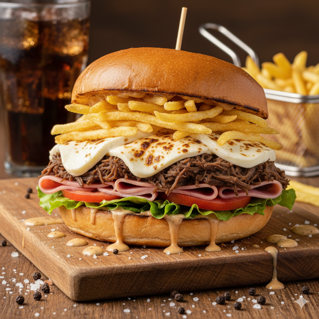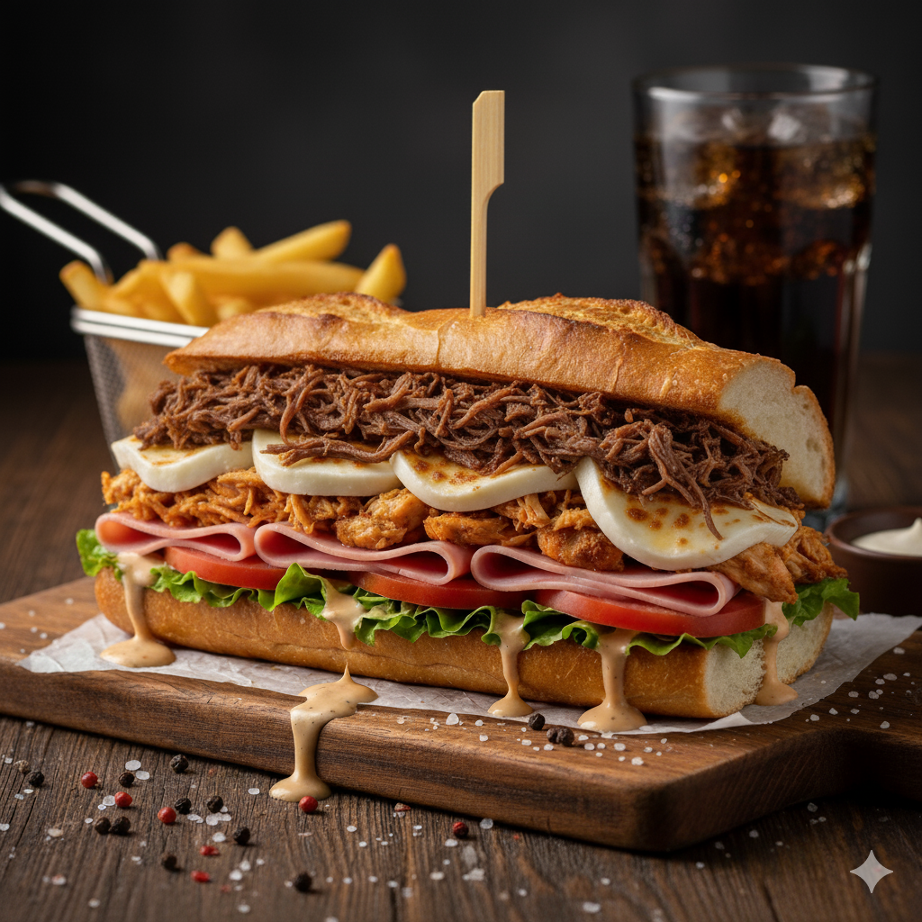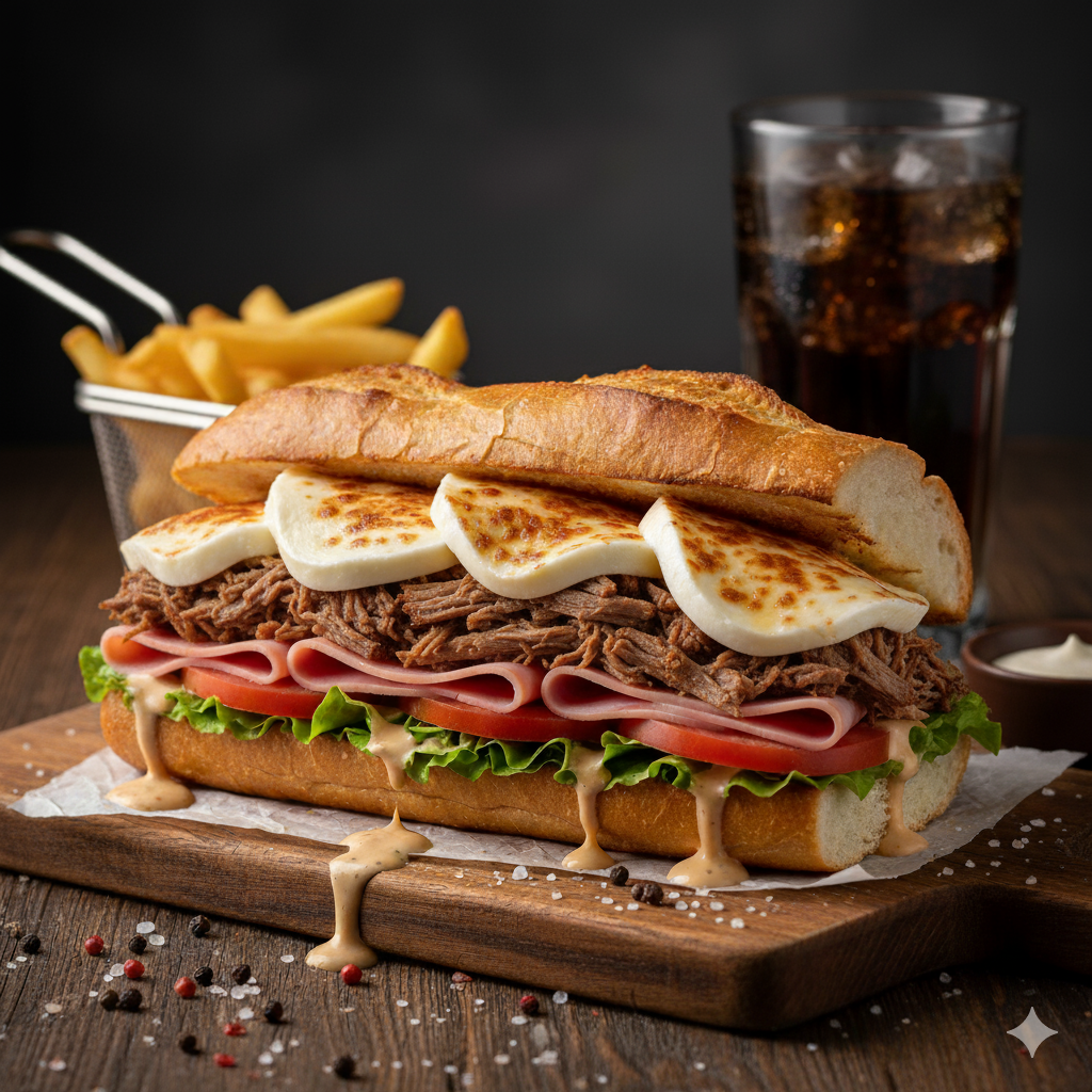 Pan francés, jamón, queso, tomate, lechuga, carne desmechada, salsa de la casa.