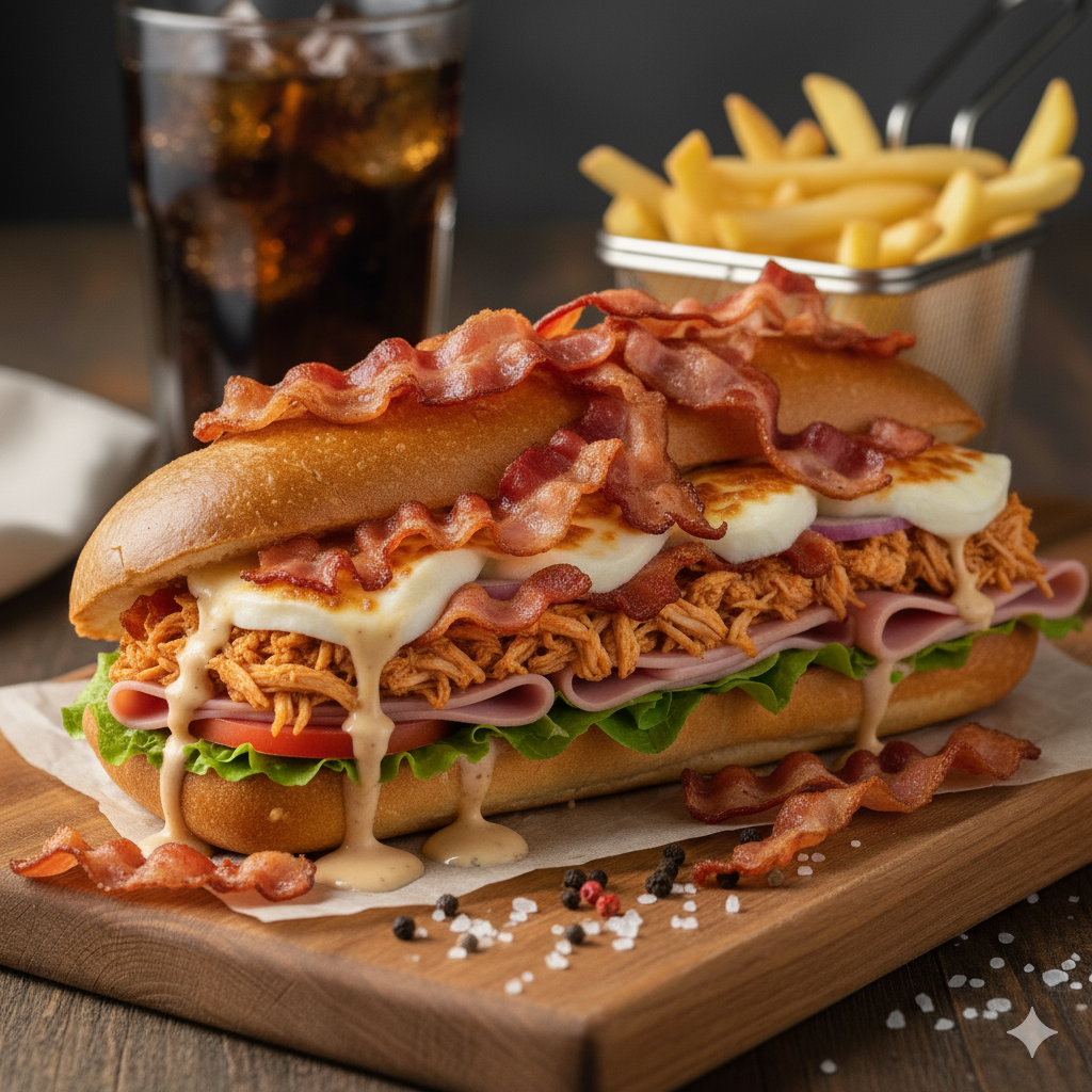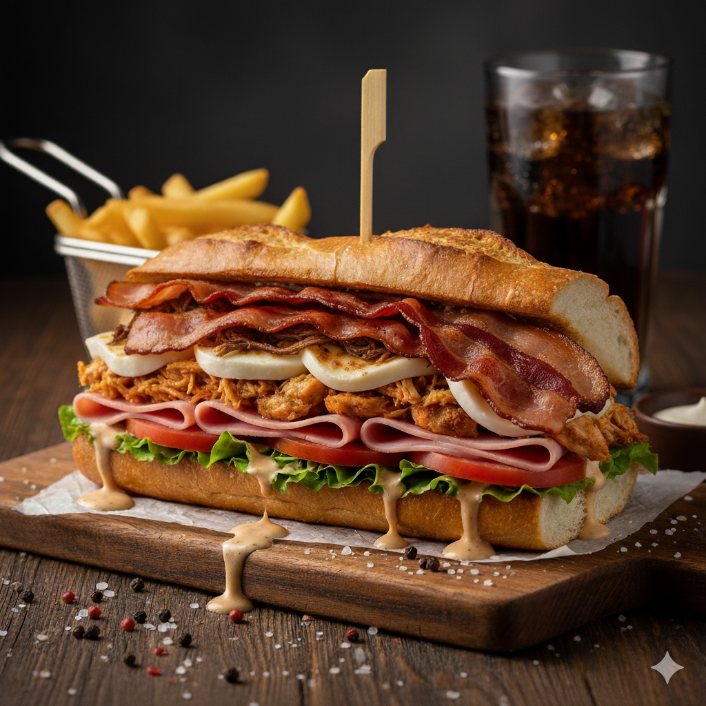 Pan francés, jamón, queso, tomate, lechuga, pollo desmechado, salsa de la casa, tocineta.