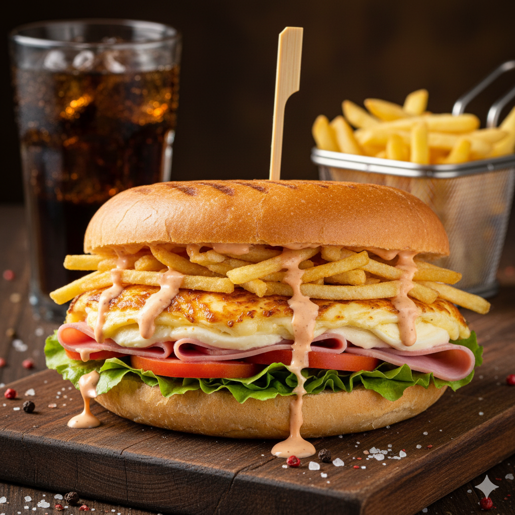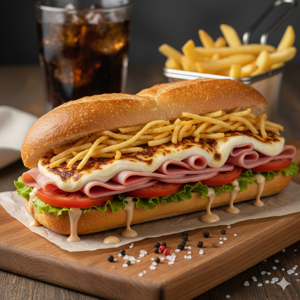 Pan francés, doble jamón, tomate, lechuga, queso, ripio, salsa de la casa.