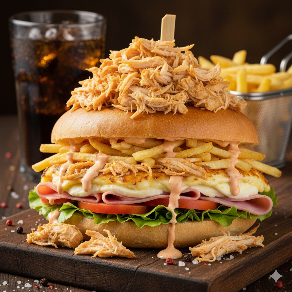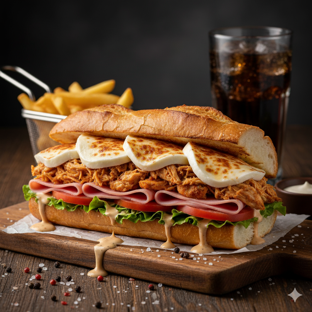 Pan francés, jamón, queso, tomate, lechuga, pollo desmechado, salsa de la casa.