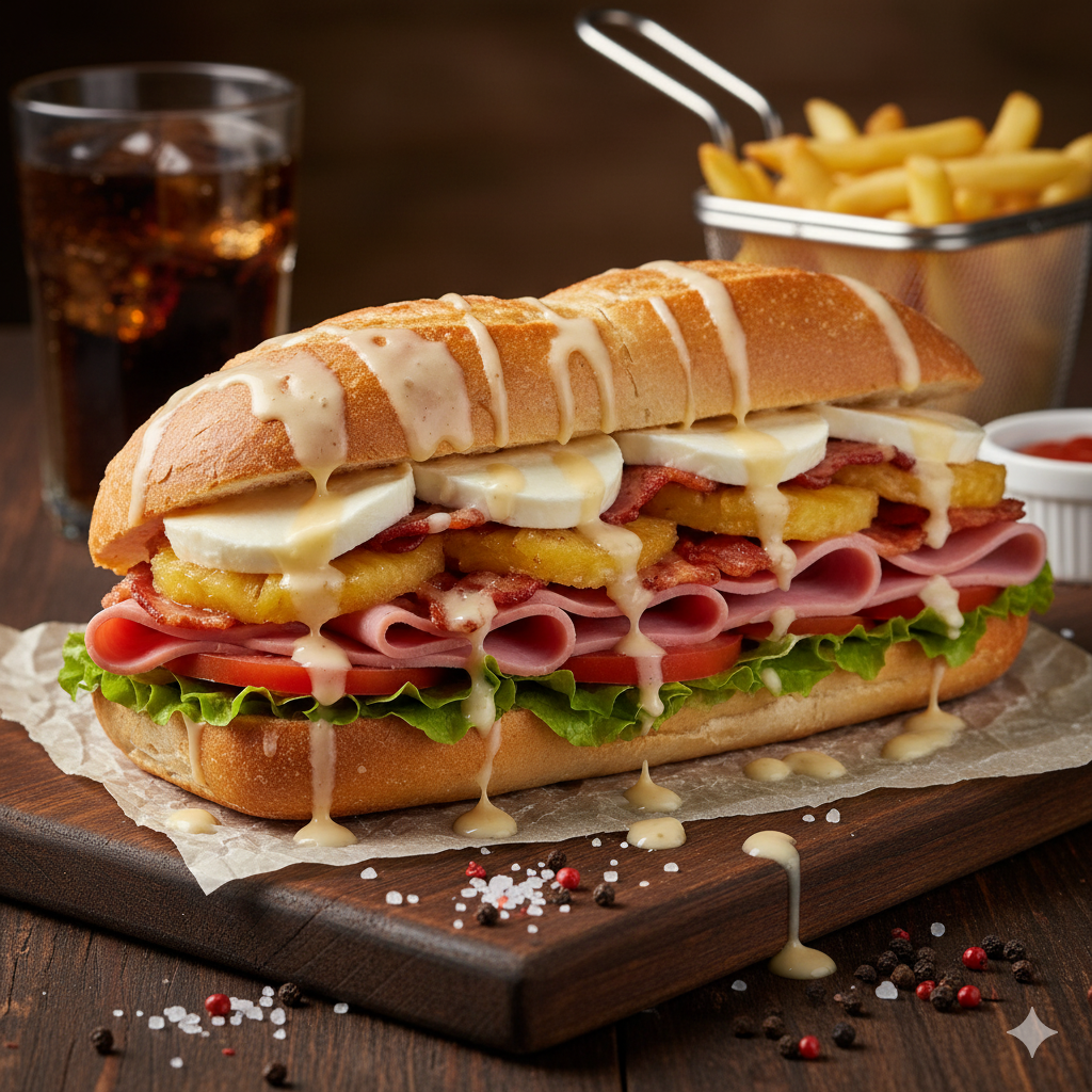 Pan francés, piña calada, queso, jamón, tocineta, salsa de la casa.