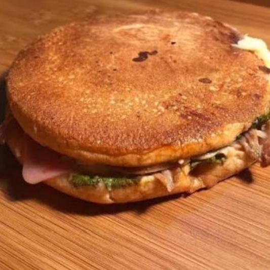 Pan redondo, carne desmechada, tocineta, doble queso, salsa de la casa.