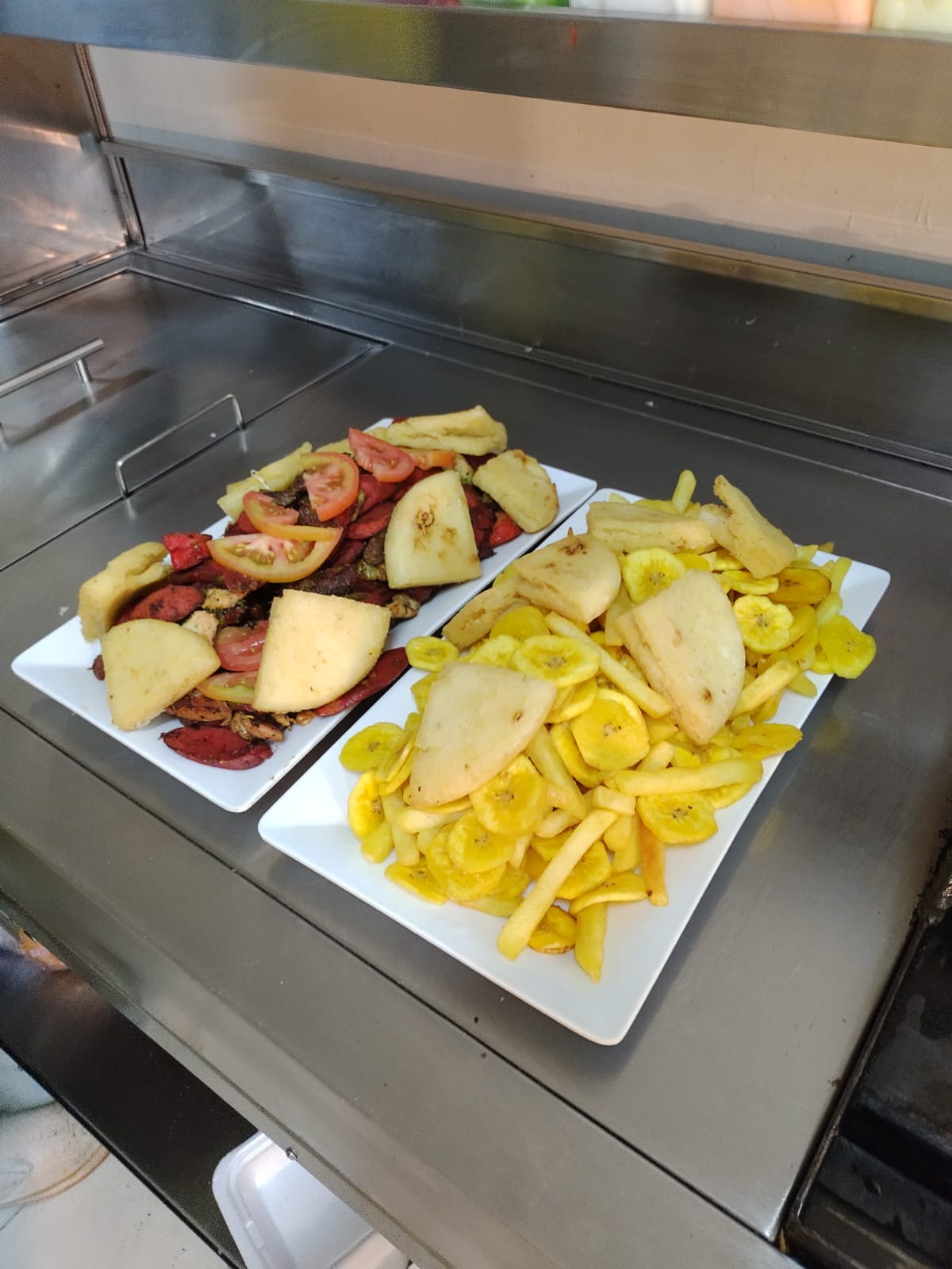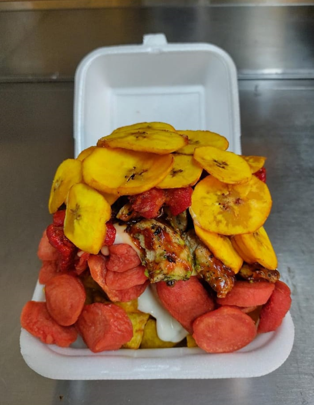 Carne, pollo, costilla, plátanitos.