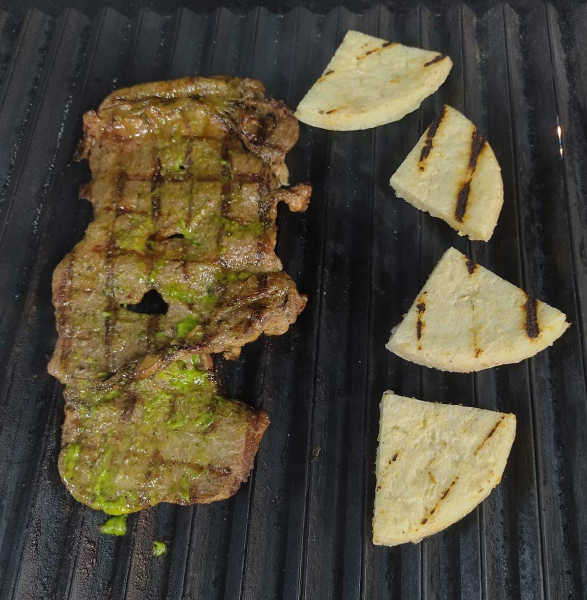 Chuleta de cerdo de 300 g. Acompañada de papa amarilla, ensalada y arepa.