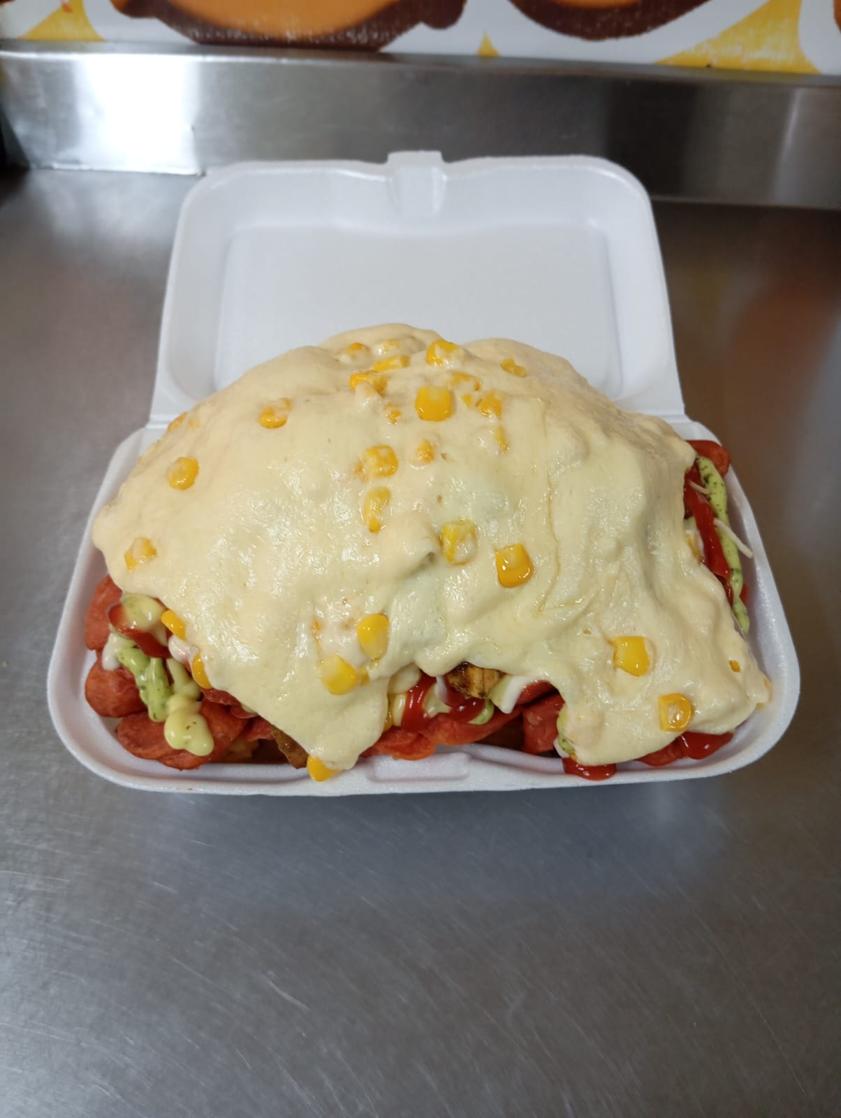 Maíz, filete de pollo en trozos, ripio, queso derretido.