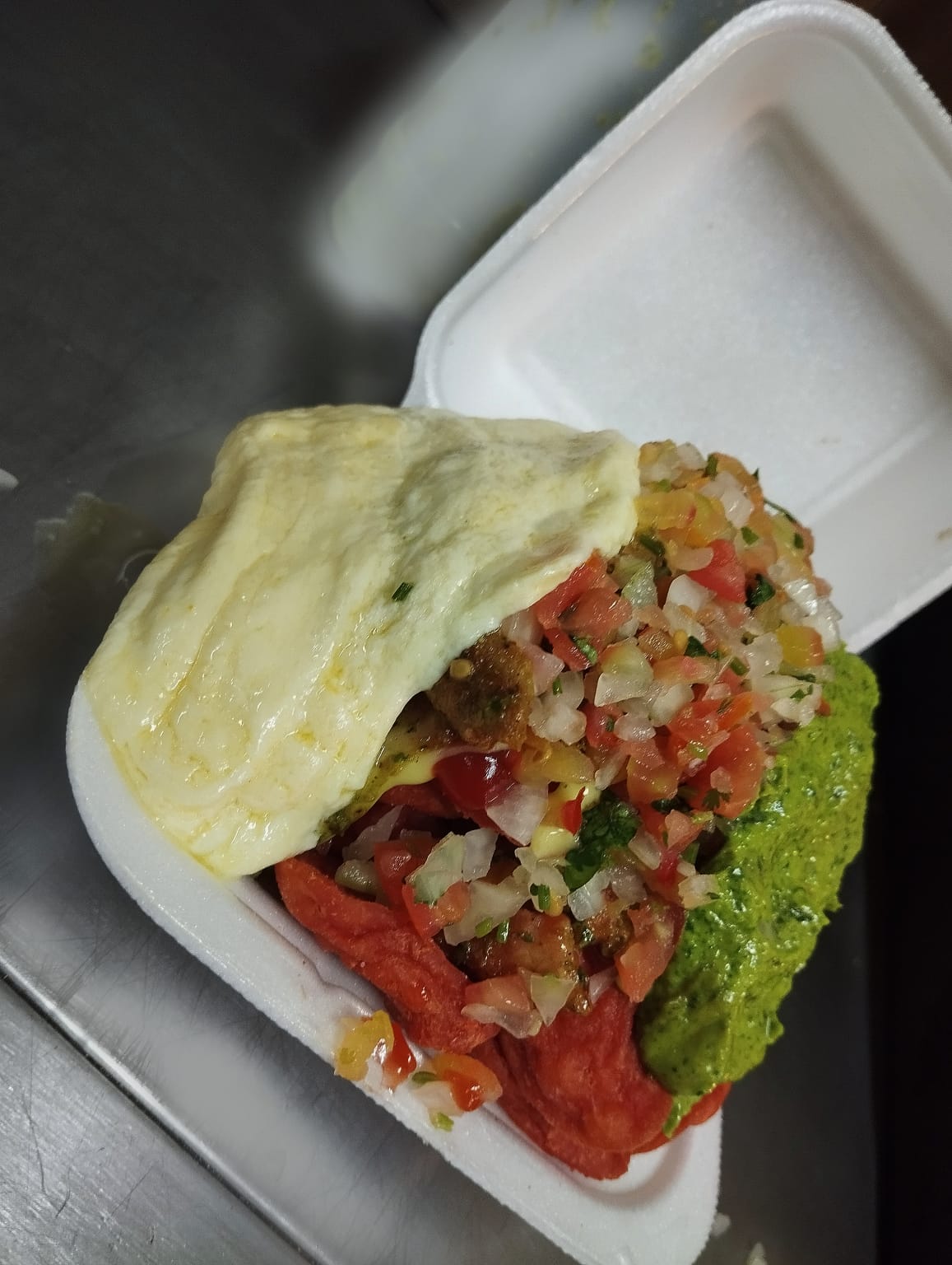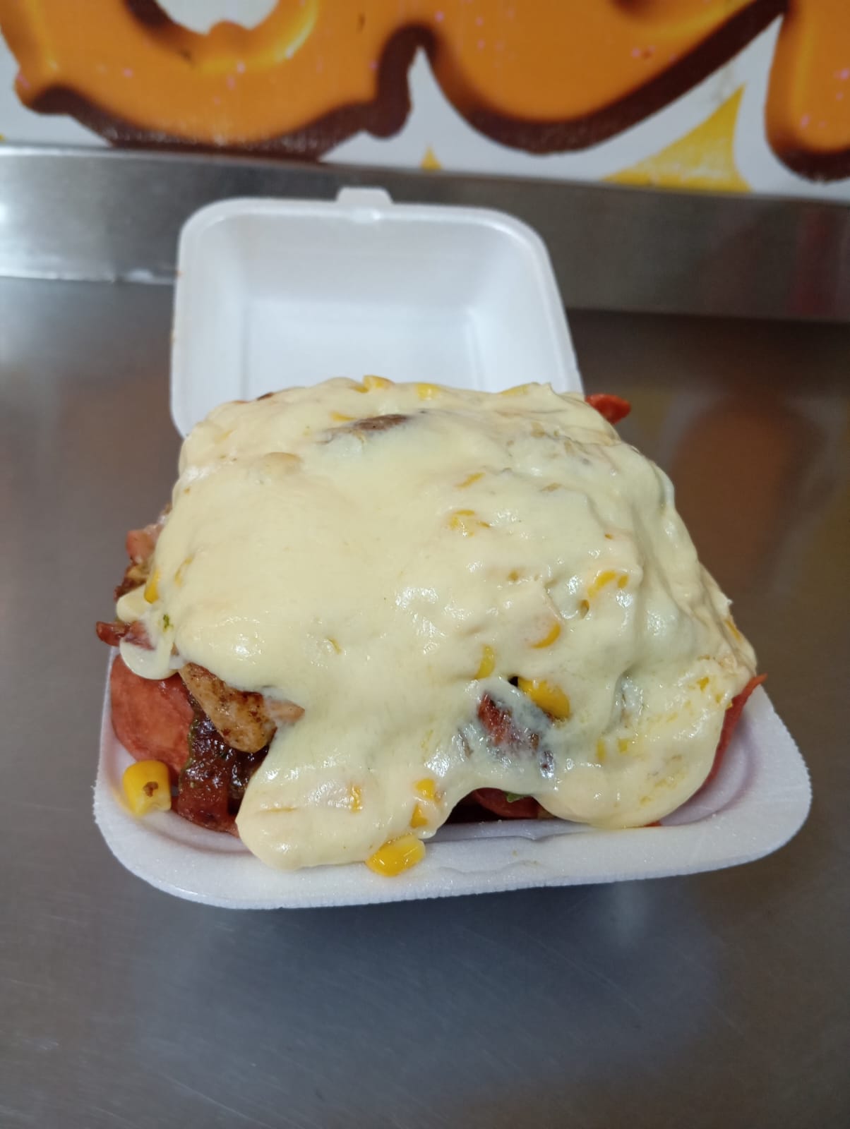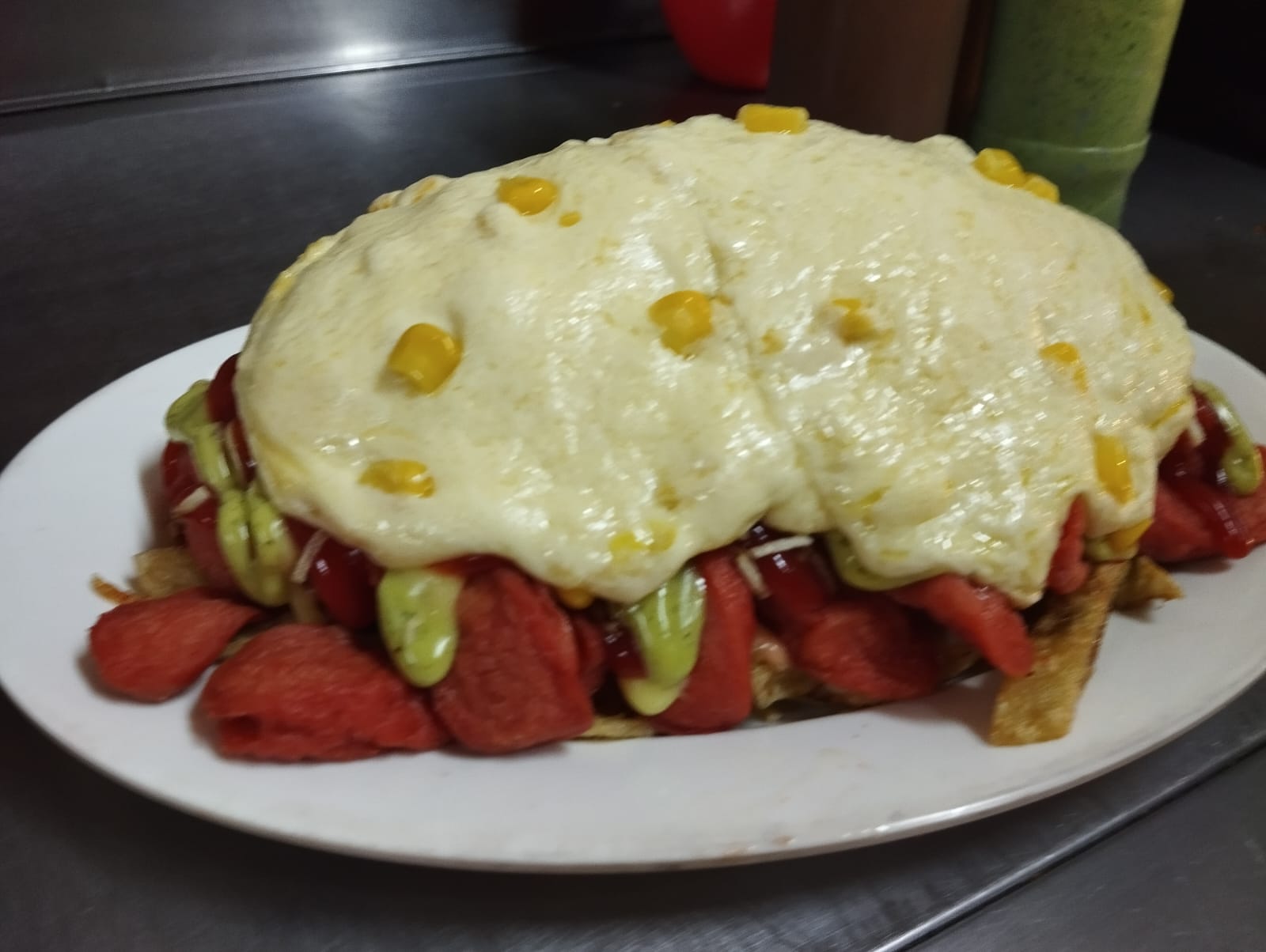 Lechuga, carne, pollo, tocineta, queso, maíz, ripio y queso derretido.