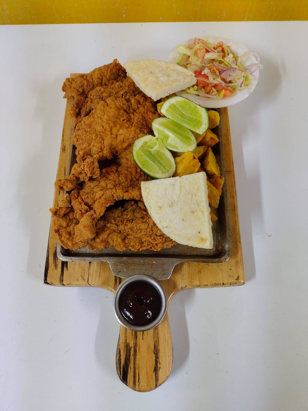 Chuleta de pollo de 300 g. Acompañada de papa amarilla, ensalada y arepa.