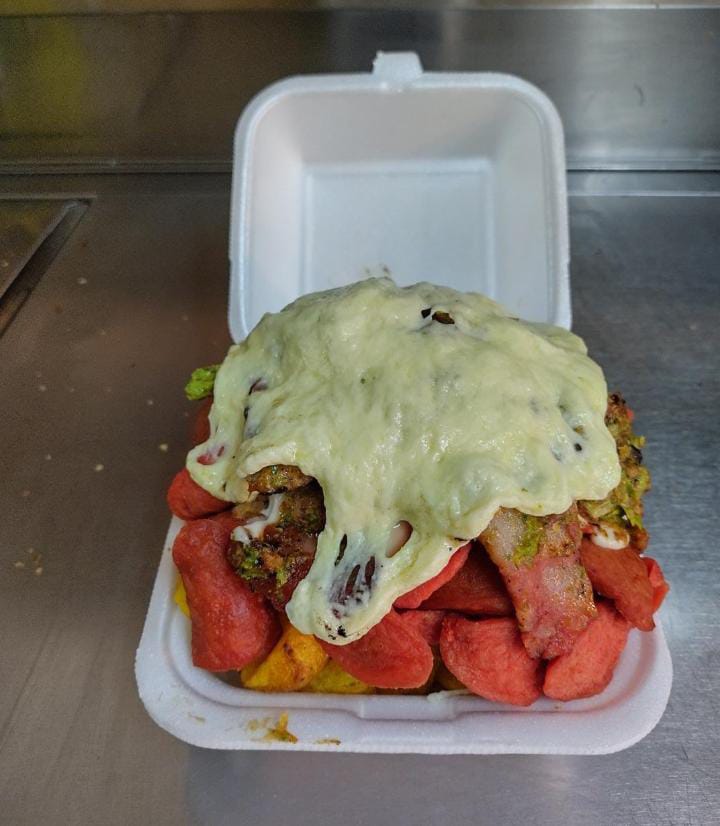 Bastante queso, papa, salchichas, salsas, ripio y tocineta.