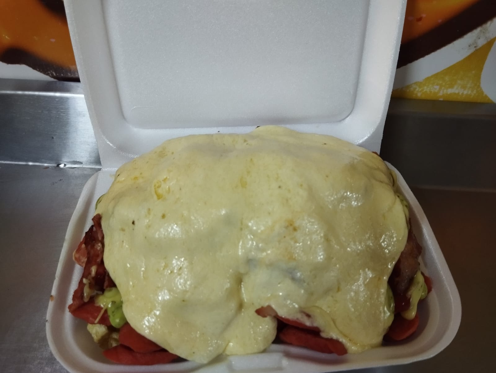 Hamburguesa carne de res, filete de pollo, queso, tocineta, lechuga, tomate, cebolla, ripio, salsas.