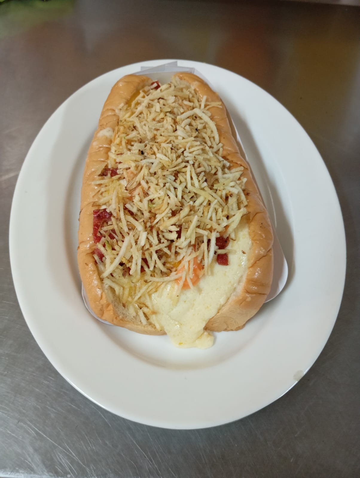Pan, salchicha ideal, queso, ripio y salsas