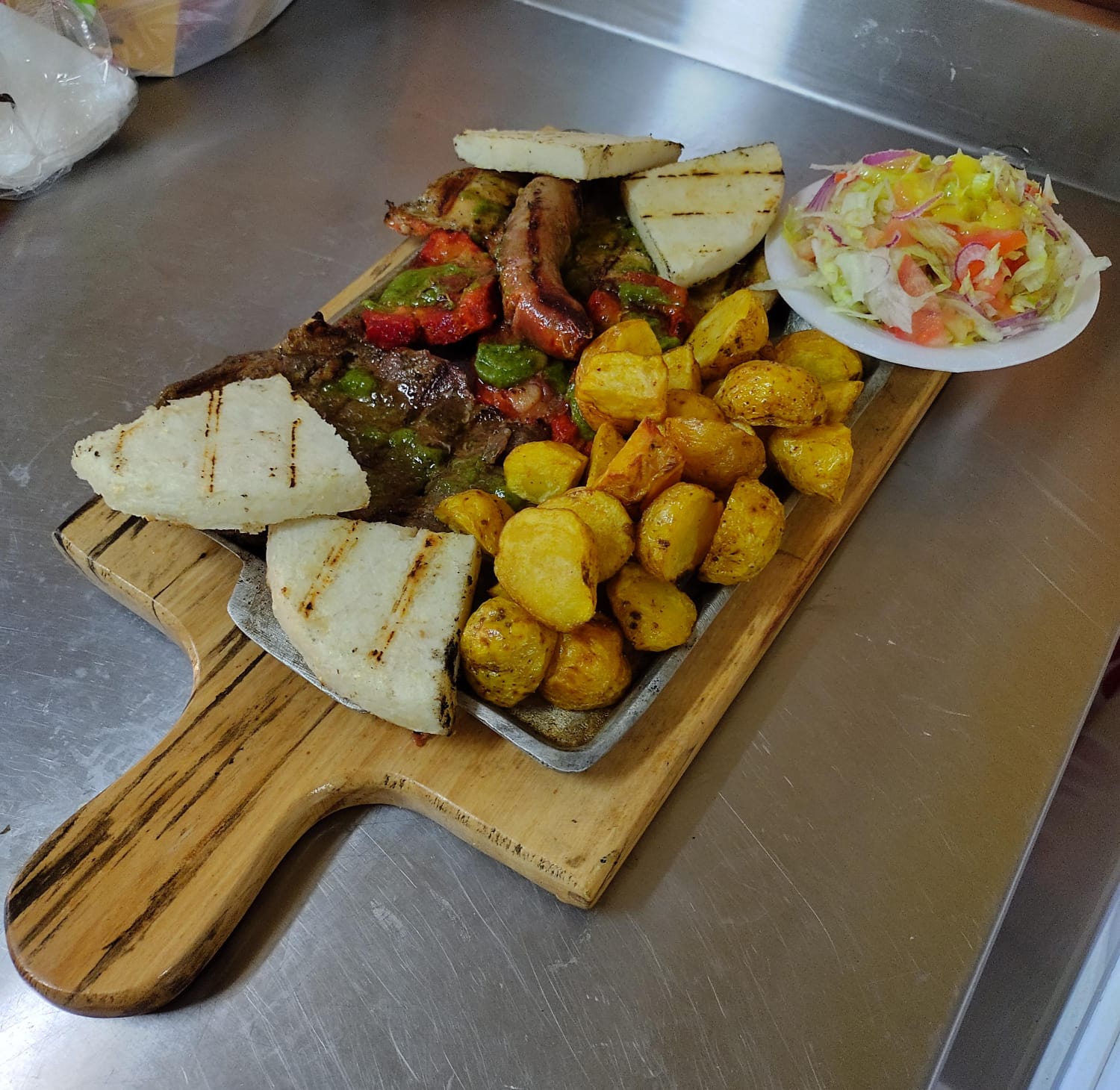 Carne, pollo, costilla y chorizo 350 g, acompañado con papa francesa, ensalada y arepa.