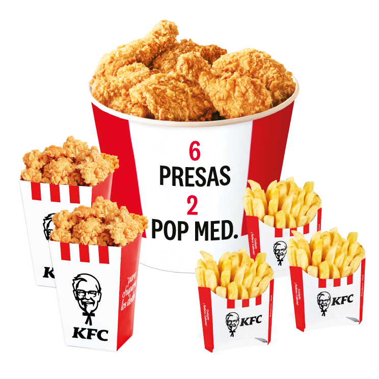 6 Presas de Pollo + 2 Pop Corn Mediano (Trocitos de pechuga apanados) + 3 Papas Pequeñas