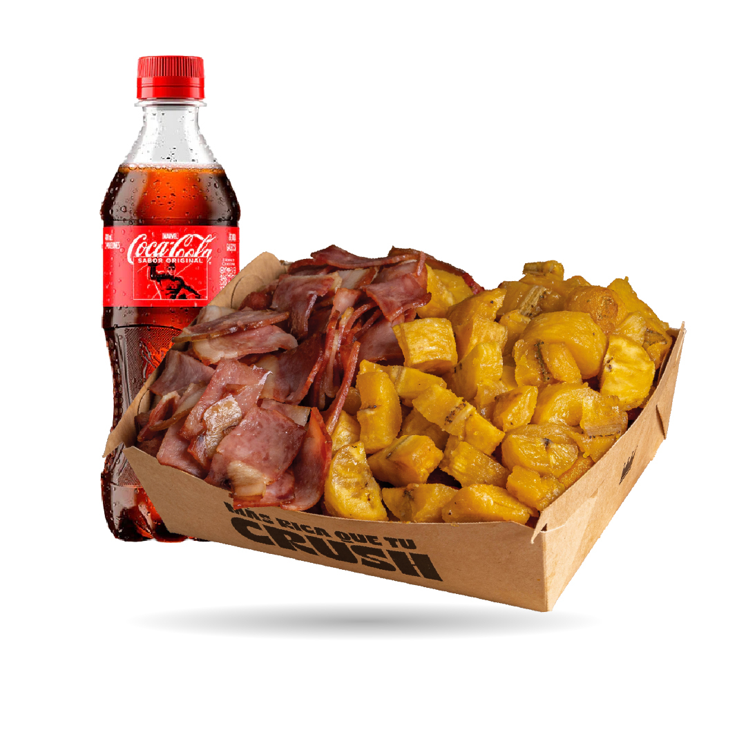 Picada personal: papa amarilla, chicharrón, costilla, pollo, yuca, maduro. peso 802 gr + bebida 400ml