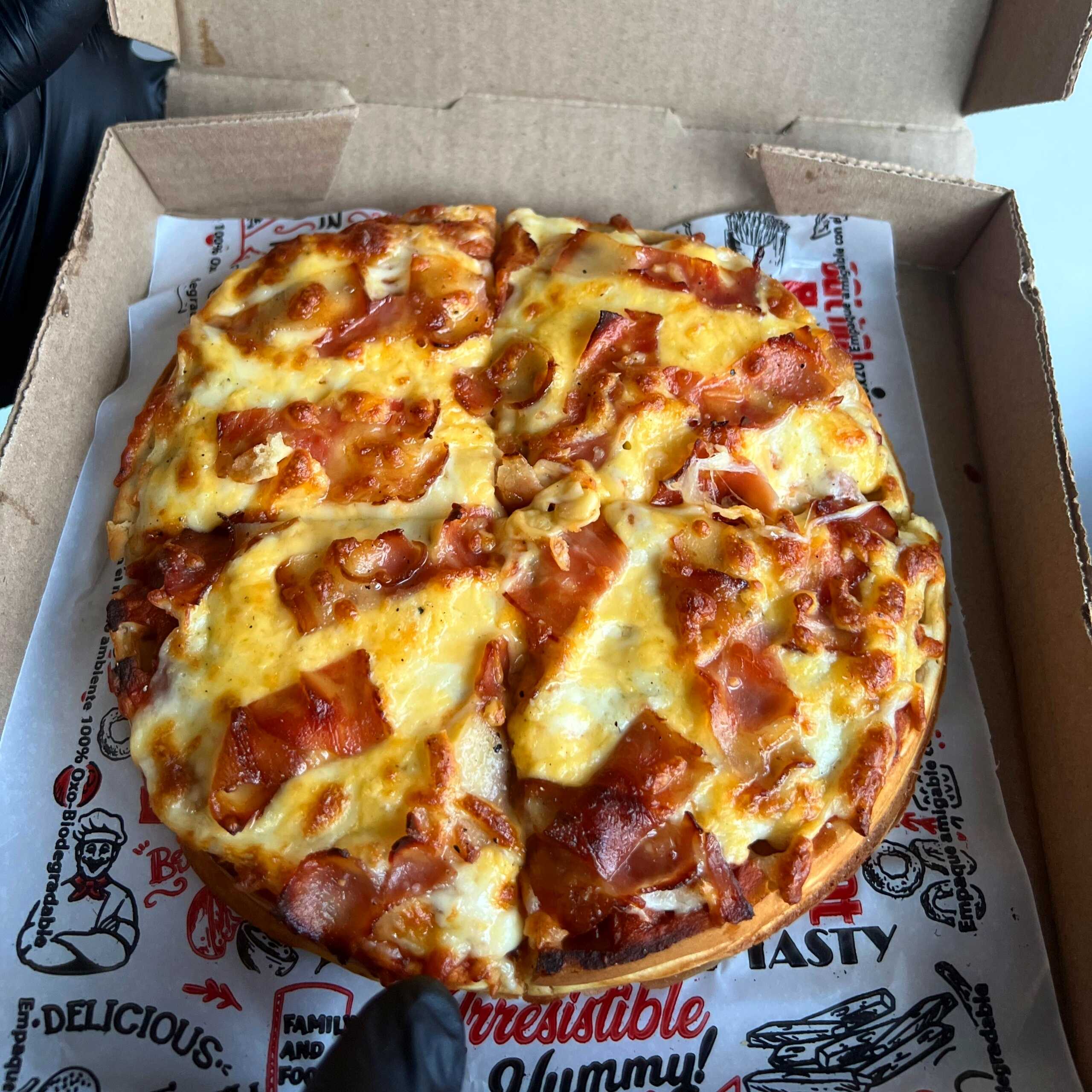 Un waffle crujiente cubierto con una deliciosa mezcla de 2 quesos (mozzarella y queso americano) tocineta premium crocante y pasta de tomate fresca.