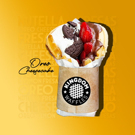 Waffle con fresa, nutella, galleta oreo, cheesecake de limón.