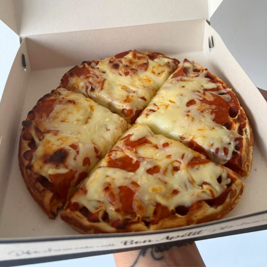 Un Waffle crujiente cubierto con queso mozzarella derretido, pepperoni y pasta de tomate fresca.
