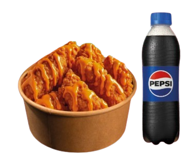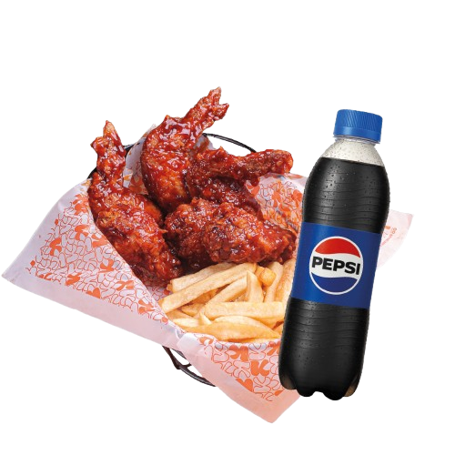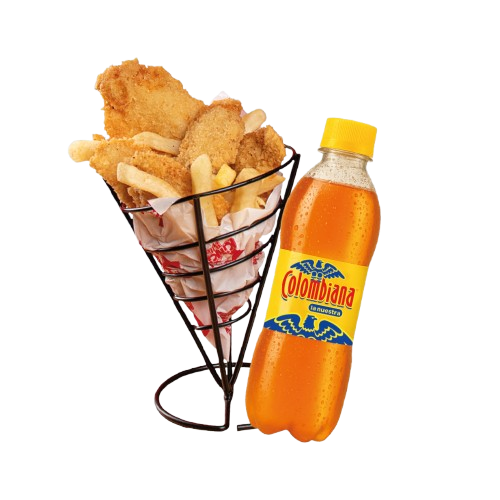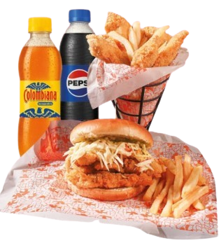 1 Burger (Pechuga de Pollo Apanada, ensalada de repollo, miel y salsa de la casa), 1 Papa a la Francesa, 6 Tenders de pollo y 2 Gaseosas 250ml