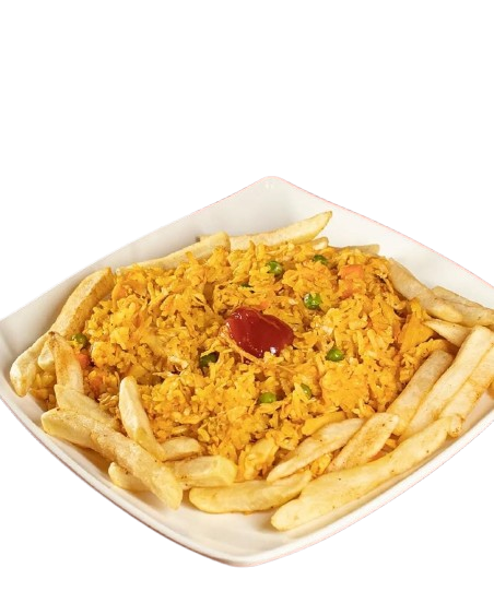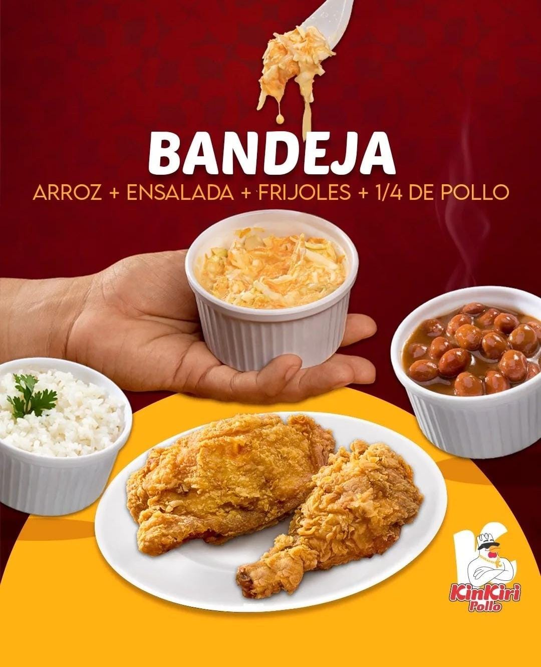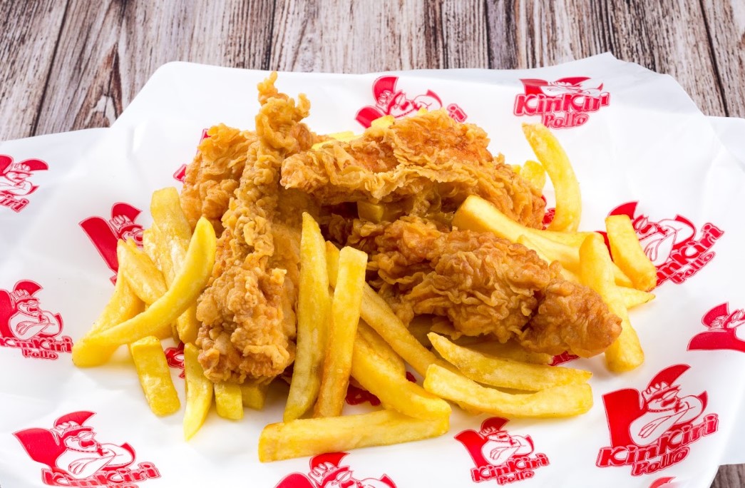 Arroz con pollo al estilo kinkiri pollo, acompañado de 120 g de papas a la francesa.
