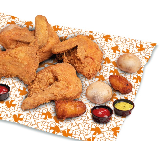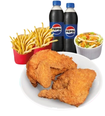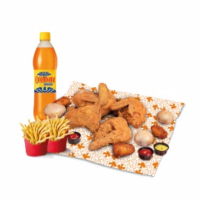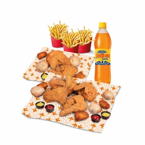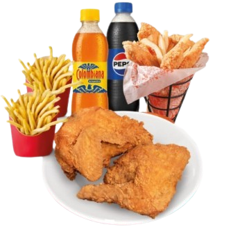 4 Presas de Polllo Asado o Apanado, acompañado de 2 Papas a la Francesa, 6 Tenders de pollo y 2 Gaseosas 250ml