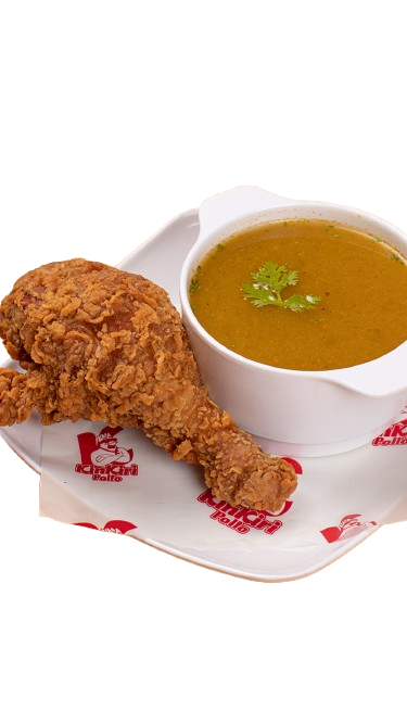 Muslo o Contramuslo Apanado, consomé, arroz, frijoles, ensalada y maduro.