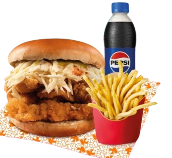 1 Burger de Pechuga de Pollo Apanada, ensalada de repollo, miel y salsa de la casa), 1 Papa a la Francesa y 1 Gaseosas 250ml