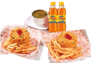 2 Arroz con pollo al estilo kinkiri pollo acompañado de 120 g de papas a la francesa y 2 gaseosas 250 ml. (Sabor sujeto a disponibilidad de la tienda) + Consome