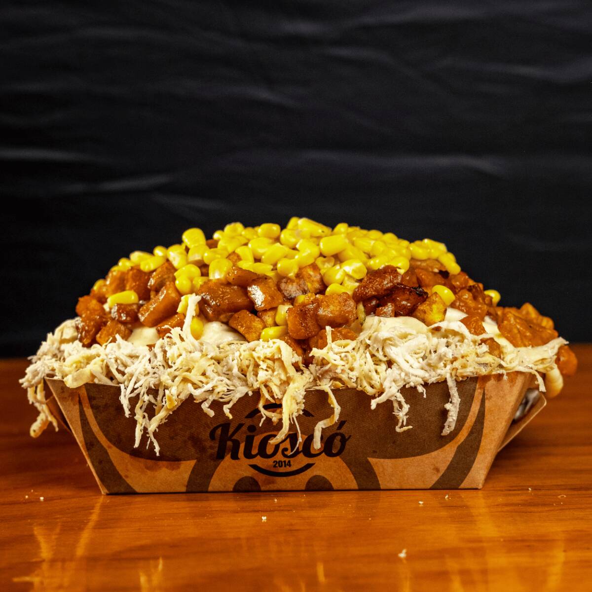Salchipapa personal con maduro, tocineta, pollo desmechado, queso mozarella, maíz y ripio + gaseosa 250ml.